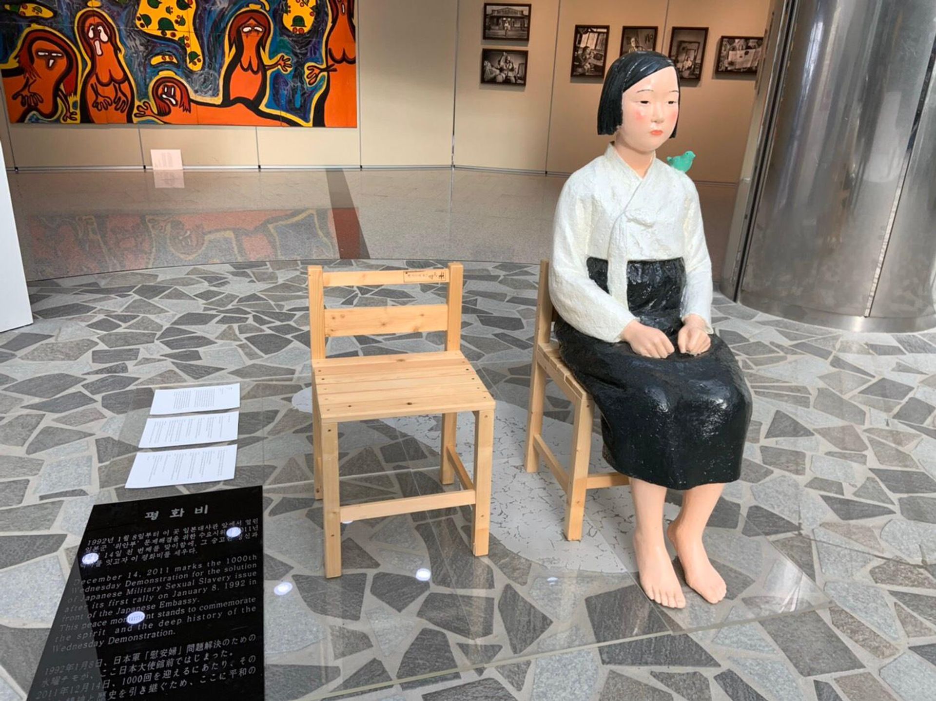 The original Japan exhibition After 'Freedom of Expression?' was closed in August 2019 after three days due to threats of violence from visitors objecting to the depiction of a comfort woman in the work Statue of a Girl of Peace (2011) by the South Korean sculptors Kim Seo-kyung and Kim Eun-sung. After over 11 artists participating in the triennial withdrew or modified their works in solidarity, and over 70 signed a statement of protest, the show reopened briefly in October for limited visitors selected by lottery.