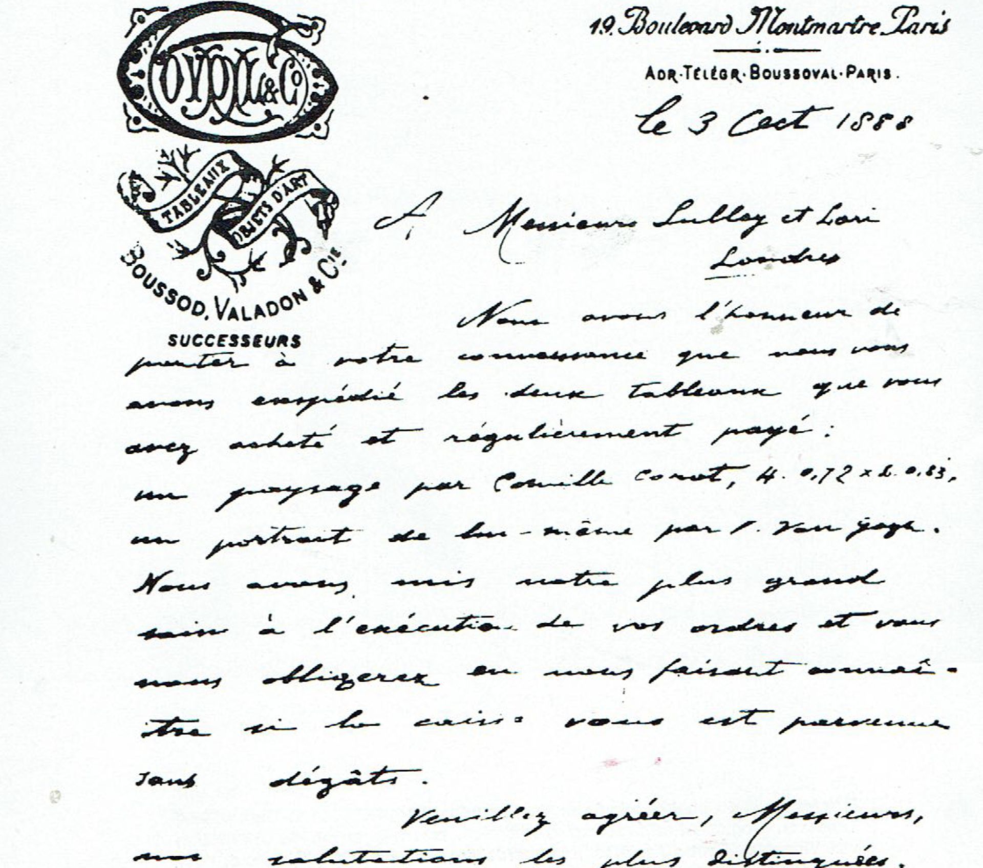 The letter recording the sale was written by Vincent’s brother Theo, who was a dealer at the Goupil gallery (also known as Boussod, Valadon & Cie) in Paris. Dated 3 October 1888, when Vincent was living in the Yellow House in Arles, it says (in translation): “We have the honour to inform you that we have sent you the two pictures you have bought and duly paid for: a landscape by Camille Corot, H [height] 0.72 x W [width] 0.83, and a self-portrait by V. van Gogh. We have put our greatest care into the execution of your orders and would be grateful if you could let us know if the box has arrived safely.”