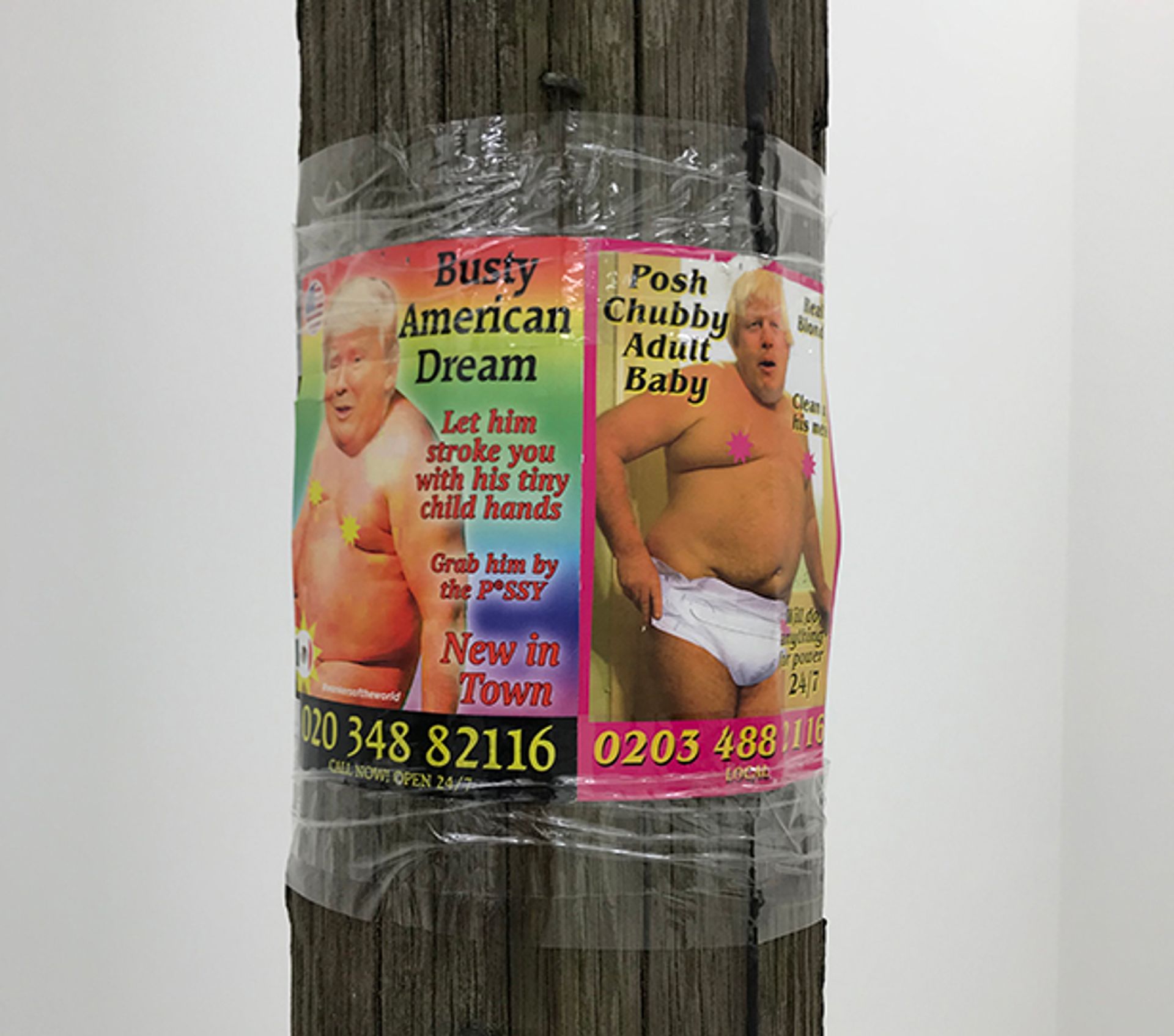 A more recent monument to a city in flux has been installed at Carlos Ishikawa, where the gallery's director and Condo's founder Vanessa Carlos has filled the main gallery space with Lloyd Corporation’s forest of severed wooden telegraph poles. These act as impromptu billboards for street notices and advertisements gathered mainly from the streets of London over the past year or so. Here, local and global meet and sometimes clash, whether in the form of a flyer demanding justice for victims of the Windrush scandal; a pair of satirical prostitute cards mocking Donald Trump and Boris Johnson; a notice announcing a found rabbit; or an advert for a massage. Mounted on now increasingly rare cable carriers, these lo-fi street texts also pay tribute to a more democratic, analogue means of communication. Signs, signifiers and symbols also abound in the gallery’s back-room on a giant painting by Dickon Drury from Glasgow’s Koppe Astner, which offers a lexicon of art historical references and still life tropes—from a jutting Chardin knife to a Warhol banana—all rendered in a garishly contemporary palette.