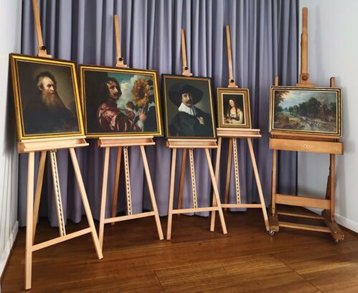 One bubble-wrapped package contained Hans Holbein the Elder’s 1510 portrait of St Catherine in a white, low-necked dress trimmed with gold, her auburn hair flowing across her shoulders, holding the spiked wheel with which she was tortured. The others were a 1535 Frans Hals portrait of an unknown smiling, moustachioed gentleman wearing a large black hat and white collar; a country road with farmers’ wagons and cows once attributed to Jan Brueghel the Elder and now thought to be a studio work; a copy of an Anthony van Dyck self-portrait with a sunflower by one of the artist’s contemporaries, and a 17th-century portrait of an old man attributed to Ferdinand Bol.