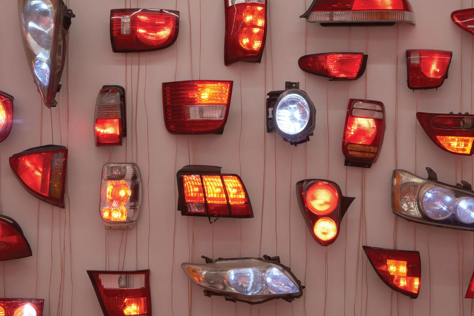 I was quite taken with Heads/Tails, an installation by choreographer Madeline Hollander in Bortolami’s 55 Walker project space that pitted hundreds of car headlights and taillights against each other on facing walls of a cave-like room. The lights went on and off, seemingly at random, but actually were keyed to the algorithmic operation of traffic lights at the corner and to braking patterns of motorists driving down the street—a choreography native to urban life and controlled by both robots and human authorities.
