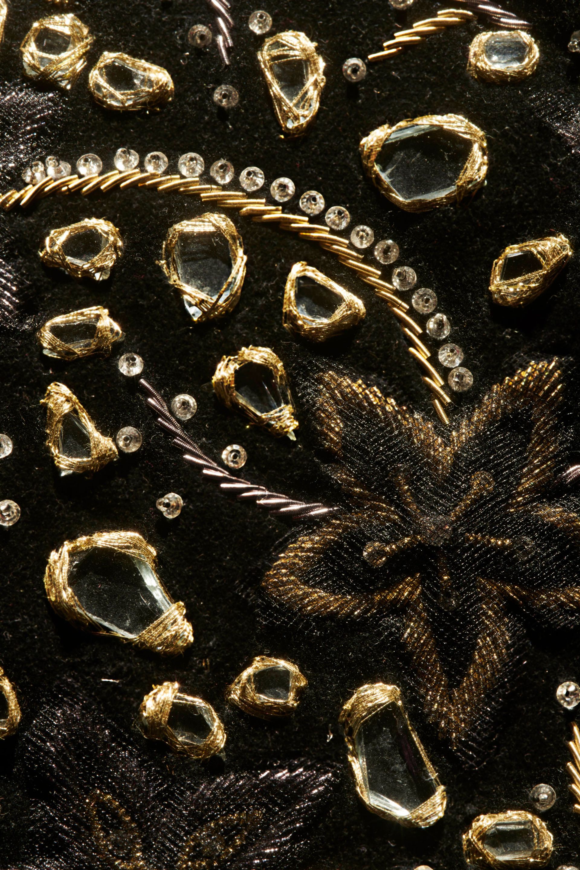 Teresa Margolles, detail of El Brillo: One assassination shapes the world (Un asesinato forma el mundo) (2020), garment hand-embroidered in goldwork bullion style with glass shards from a site where violent acts occurred in Culiacán, Sinaloa, Mexico, 2019, 24K gold thread, bullion, tulle, display form