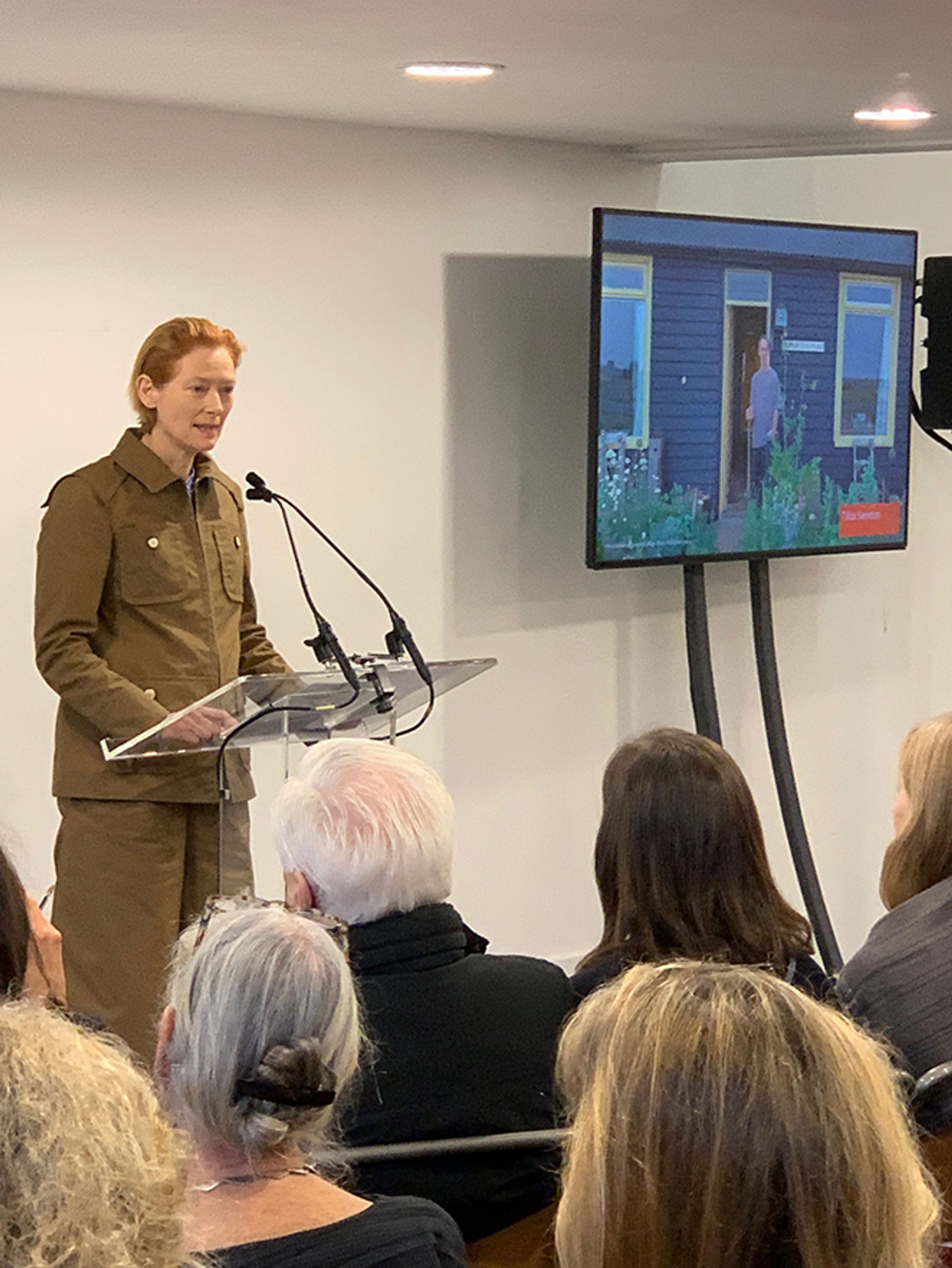 Tilda Swinton speaks at the launch of the public campaign to save the house and cottage of the late Derek Jarman © The Art Newspaper/Gareth Harris