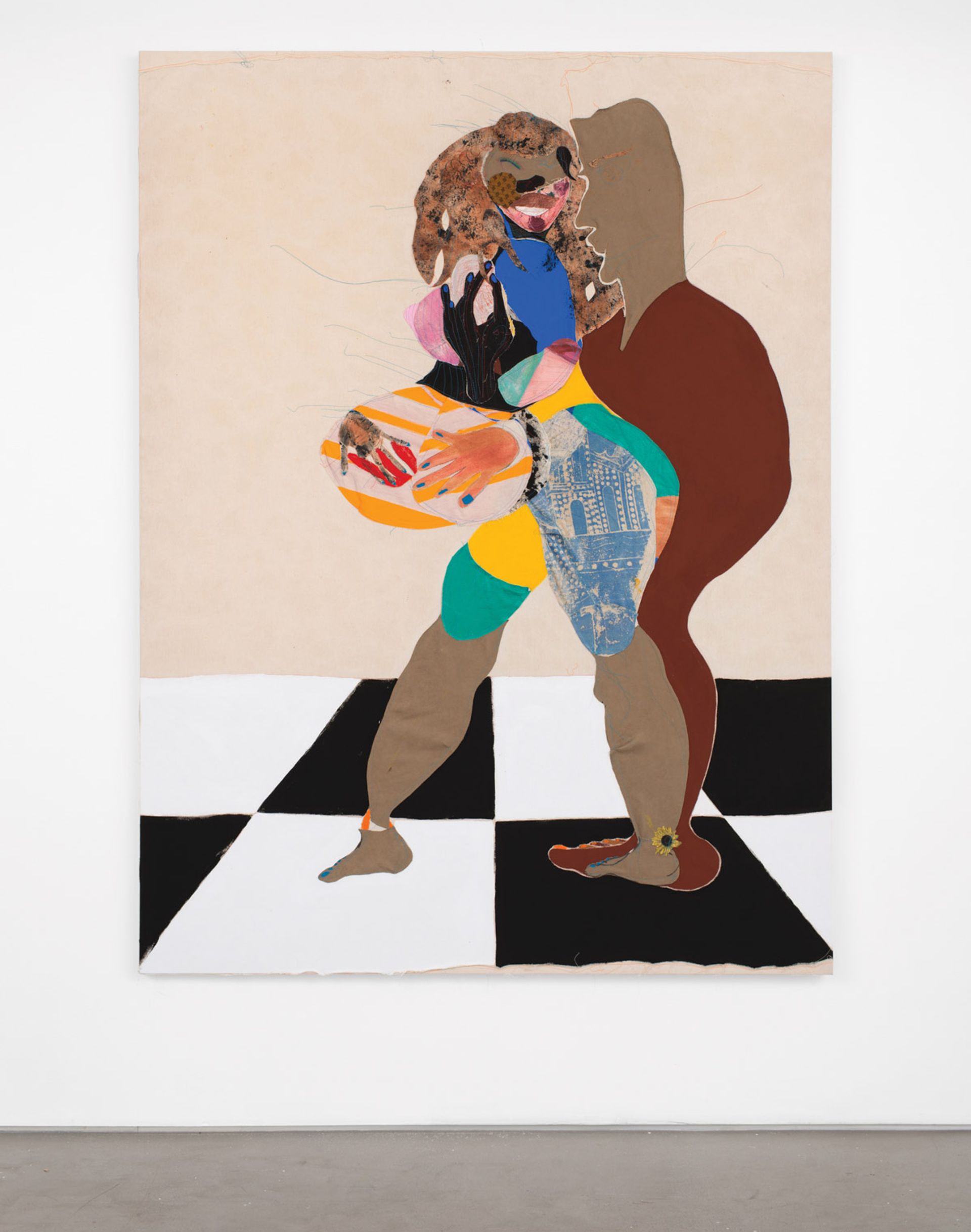 Tschabalala Self: The title goes back to the earliest work in the show, [from] 2015, when I’d just left school. At the time, my work was grappling a lot with identity politics. I fantasised about liberating myself from conversations around my otherness. I sought to transgress the idea of a gendered and racialised body. So that’s one half of the double entendre—out of body. Now I feel differently: I don’t think you can ever separate yourself from your lived experience—and I do not believe there is much to gain by doing so. The other part of the titles refers to an imagining of my figures’ inner lives, spirituality and sentimentality. “Out of body” usually refers to a spiritual or transcendent experience. The subjects of my paintings have both existential and political concerns. In my show at the ICA Boston I’m proposing the idea of the body as vessel, the container for both secular and metaphysical conjecture.
