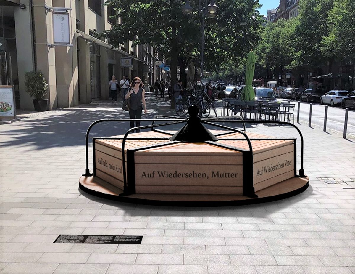 The wood-and-metal carousel can be pushed and mounted but only turns very slowly. It is to be installed at a central crossroads not far from Frankfurt main station as “a statement by the city against growing anti-Semitism and to anchor the history of the Shoah in Frankfurt’s cityscape in the form of a memorial,” according to a press release from the city government.