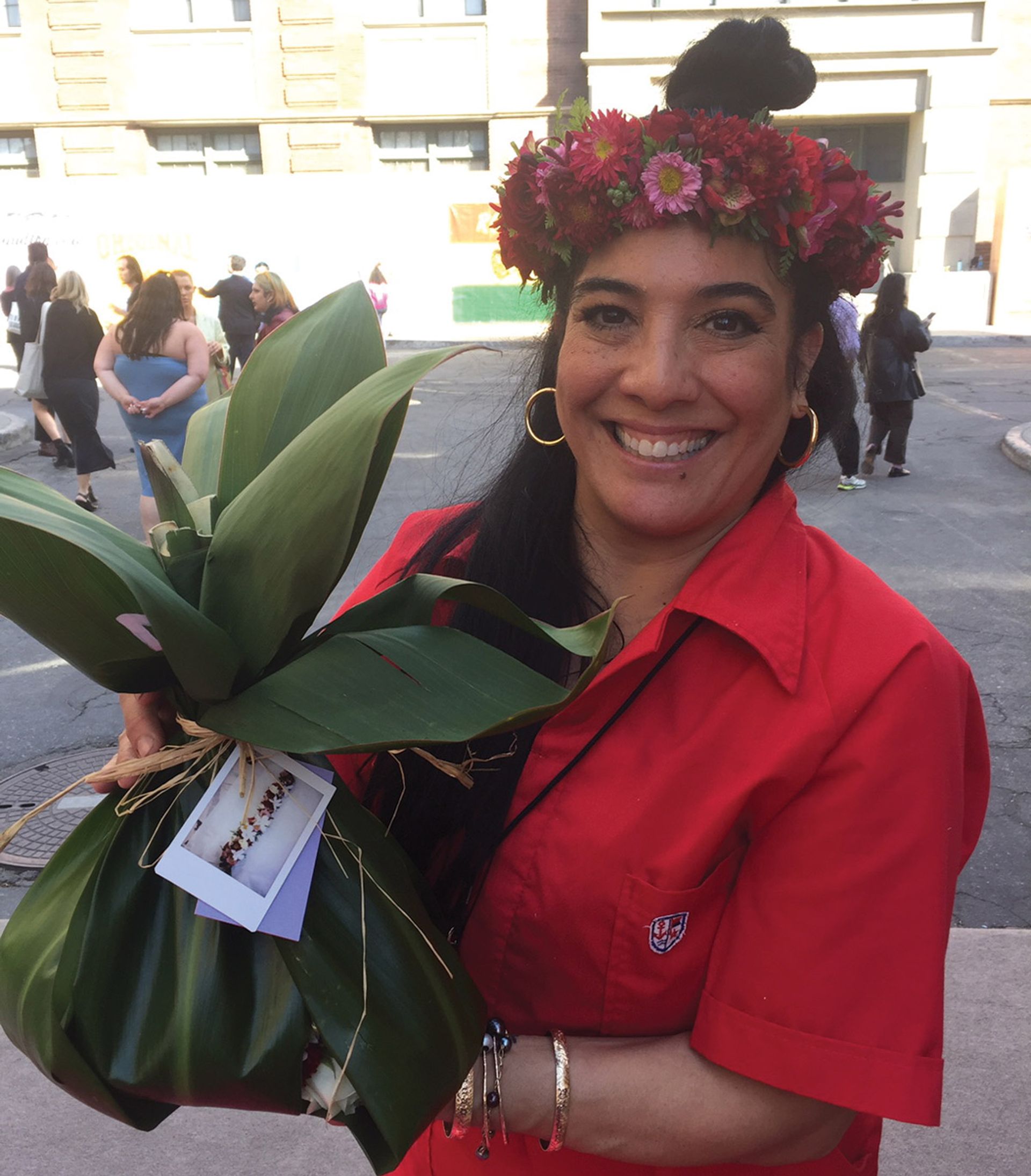 Leilani Huggins of Pretend Plants and Flowers with a lei wrapped in tea leaves Nancy Kenney