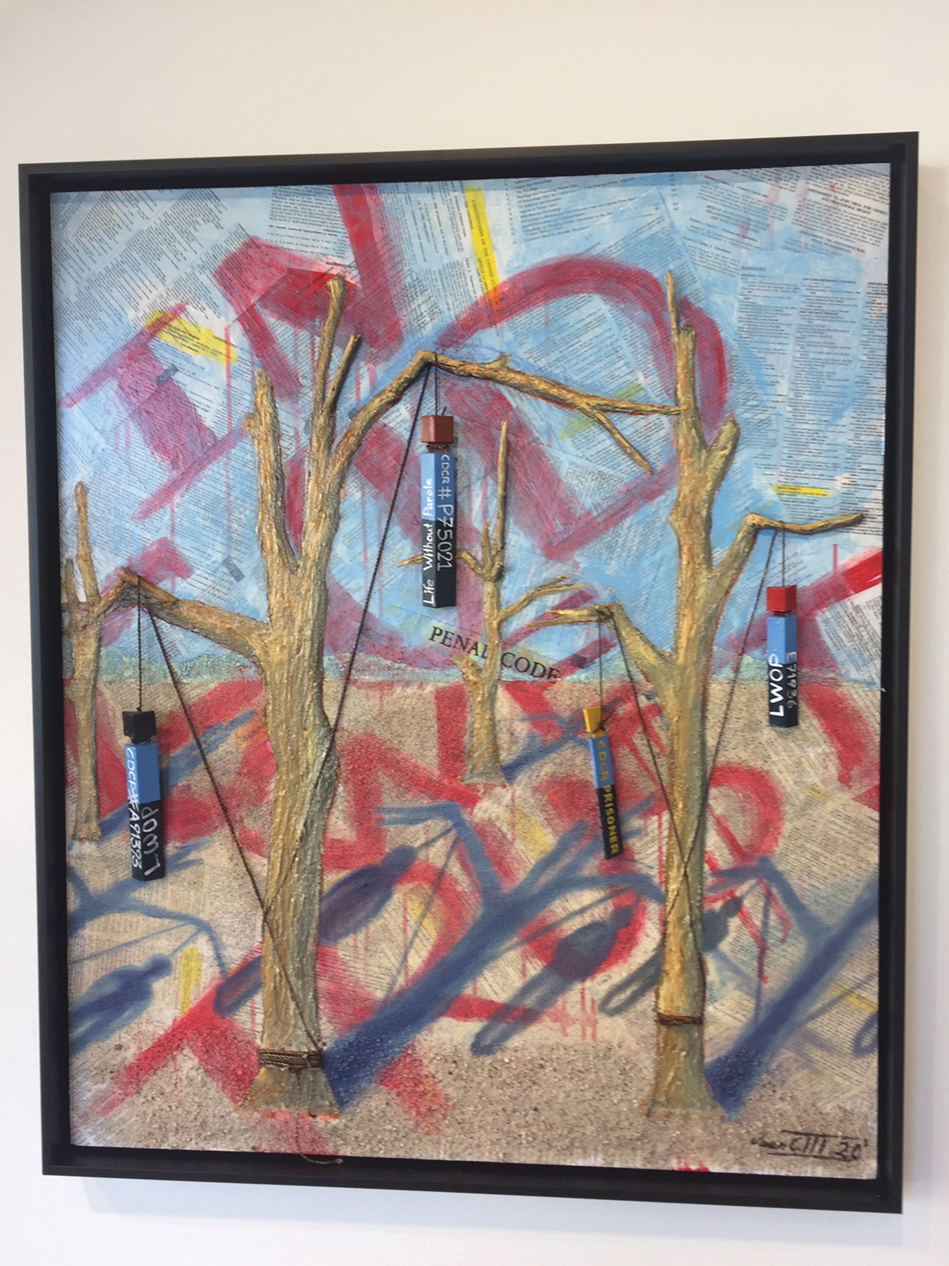 The 10 artists in the exhibition Out of Bounds on the Frieze backlot share a common history: all have participated in a novel studio programme at the California State Prison in Lancaster. Mostly self-taught, they have pooled their talents and coached one another while working in the studio, sometimes as often as seven days a week. The tightly curated show of their work at Frieze, sponsored by the Endeavor Foundation, attests to the starkness of prison life as well as the social forces that keep the incarceration rate so high: Kenneth Webb and Victor Tapia’s paintings of youths make clear that they are destined for the cradle-to-penitentiary pipeline. Particularly striking is Juan Tercero’s collaged work made from scavenged materials, including photocopies of the state penal code and sticks dropped by birds onto the prison yard.