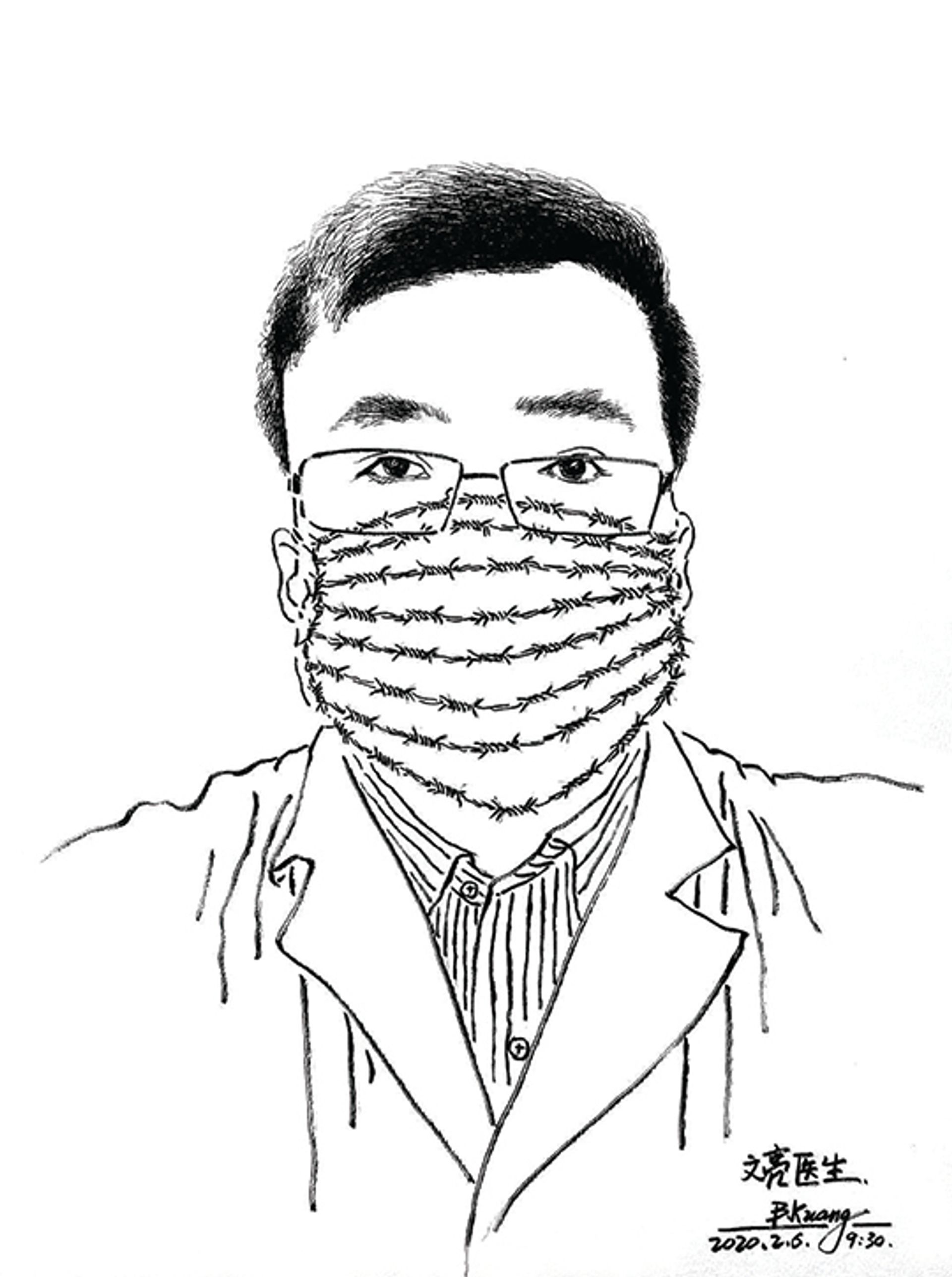 Kuang Biao's commemorative portrait of Li Wenliang , the doctor who died of the Covid-19 virus in Wuhan © Kuang Biao