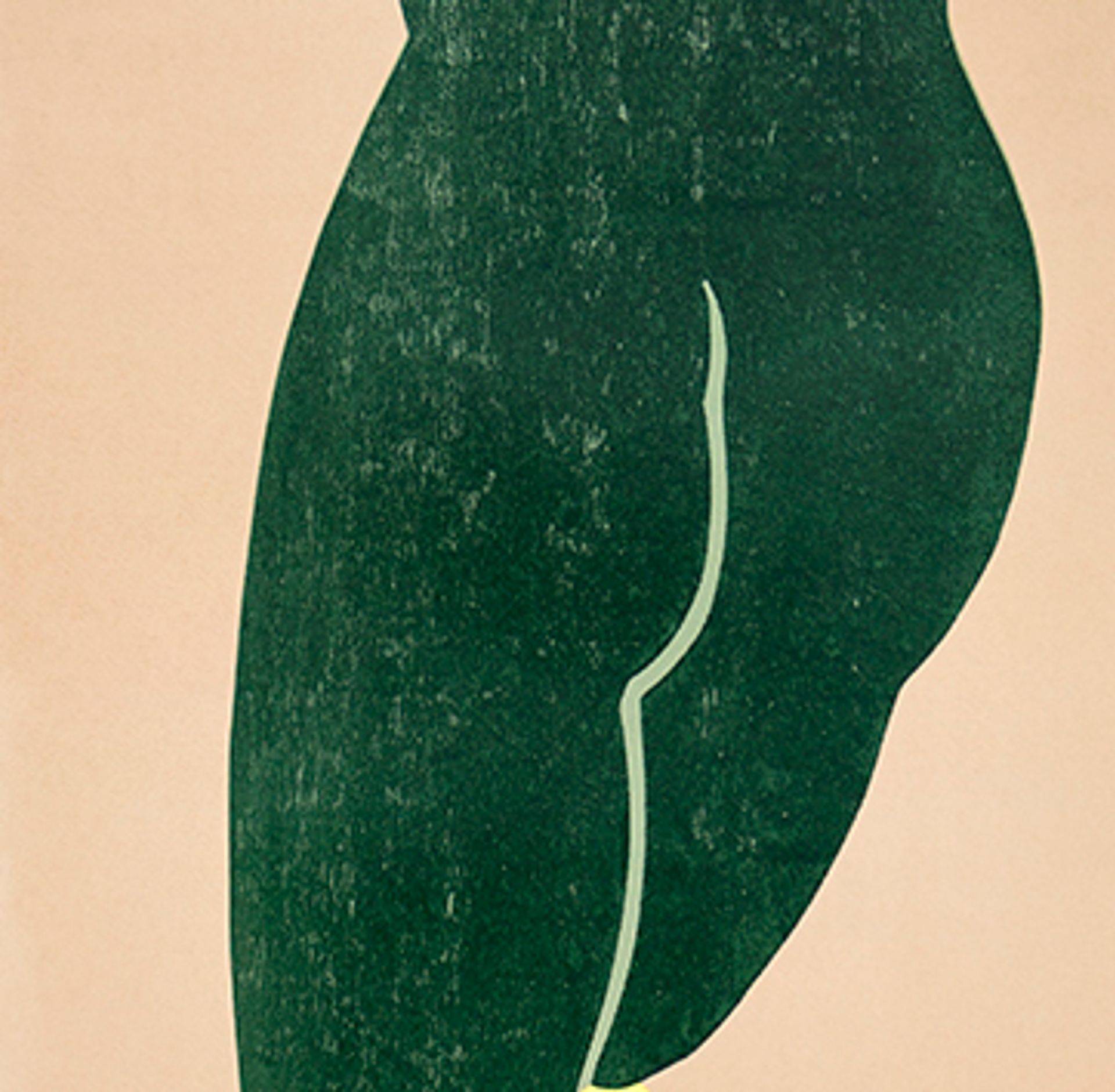 Such correspondences chime throughout the London show. Seeing Hume and Hopton’s works together en masse is on many levels a testament both to the closeness of their relationship, and to their common aims—their shared sense of the interconnectedness of things. Whether in a self-portrait photograph of Hopton sitting on a pumpkin whilst elegantly holding its provocatively-positioned stalk, or in Hume’s screen-print-on-aluminum card of a cheerleader’s stem-like arm ending in the tousled bloom of a pompom, there’s a quiet playfulness and a refined pleasure in the decorative, underpinned by consistently precise and rigorous execution. Both artists use an off-kilter palette and also pay keen attention to the humble and overlooked. In many instances, what might often appear to be abstract or random is never so, but always carefully considered and rooted in a concrete and keenly observed reality. A vividly coloured cluster of pastel scribbles by Hume turns out to be the overlaid characters of the entire Arabic alphabet, while the similarly tangled strands of wool, twine and leaves in Hopton’s After the Deluge (2019) were composed by superimposing and then meticulously editing line drawings made from nature.
