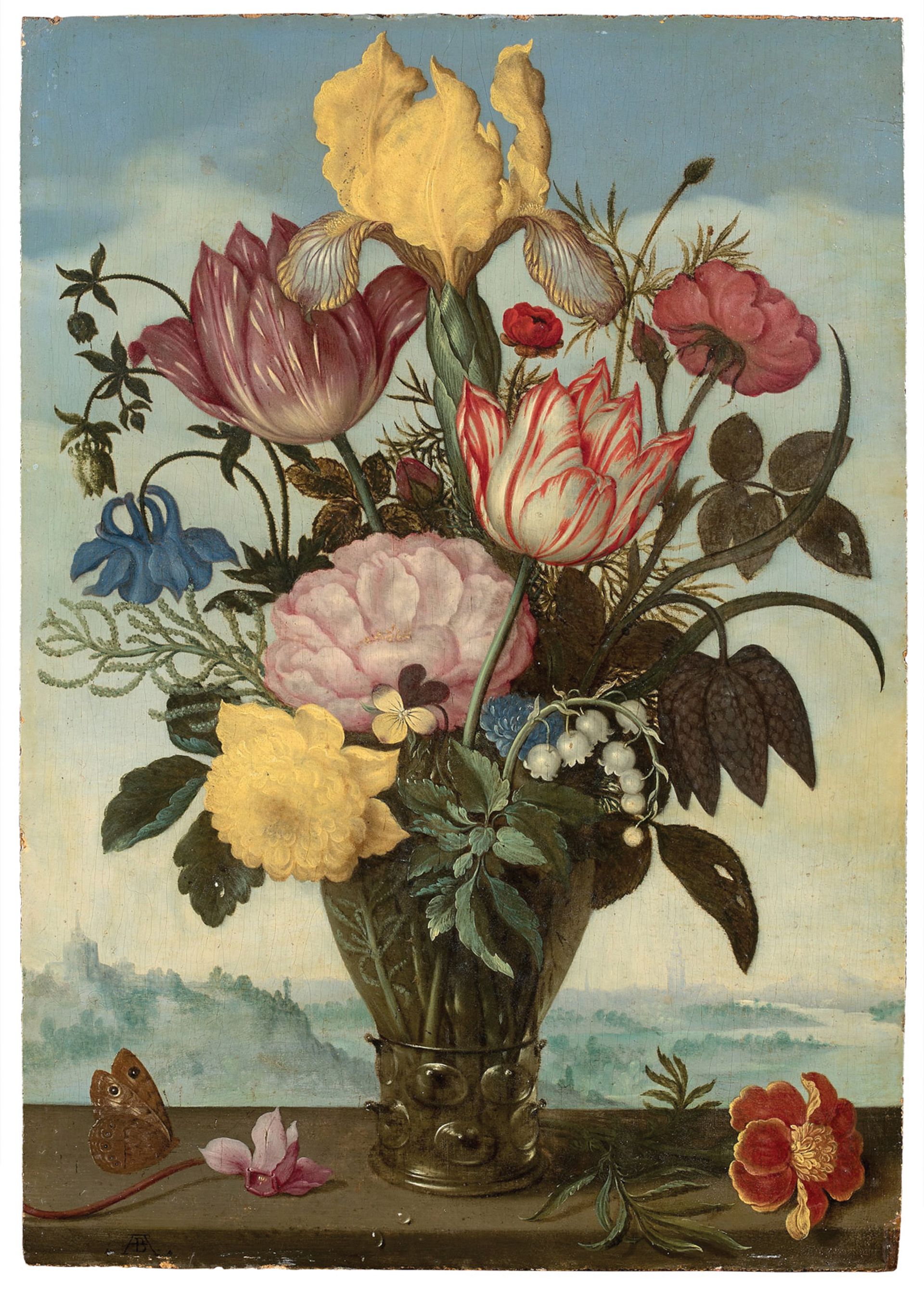 Ambrosius Bosschaert the Elder’s Bouquet of Flowers in a Römer Glass Placed on a Table with a Landscape in the Background (around 1619-21). Courtesy of De Jonckheere Ambrosius Bosschaert the Elder’s Bouquet of Flowers in a Römer Glass Placed on a Table with a Landscape in the Background (around 1619-21). Courtesy of De Jonckheere