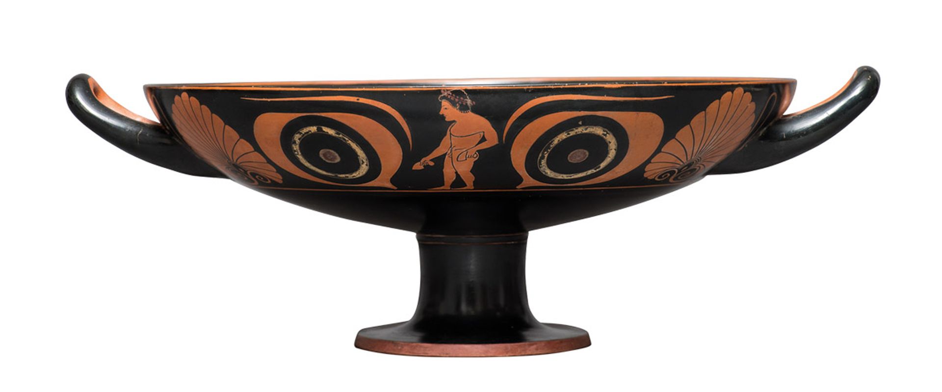 Greek terracotta cup (around 530BC), Charles Ede: the decoration of this 2,500-year-old kylix—or wide-brimmed cup—is what makes it particularly rare. It combines two techniques: black-figure painting, a discipline that dates back to 700BC, and the later red-figure method that was invented around the time this cup was made and allowed for greater detail to be painted on top of the design. The side decoration depicts red-figure nude athletes set between two protective eye motifs. The centre of the cup shows a black-figure nude satyr carrying an animal skin full of wine in one hand and a horn-shaped cup in the other. Two words are also inscribed on the shallow vessel: “Cha[i]re” and “Kalos”—the first is a greeting and the second means “the boy is beautiful”. The phrase “could be interpreted as a gay pick-up line”, the gallery suggests. Charles Ede Gallery has priced the vessel at £80,000. Greek terracotta cup (around 530BC). For sale with Charles Ede Gallery