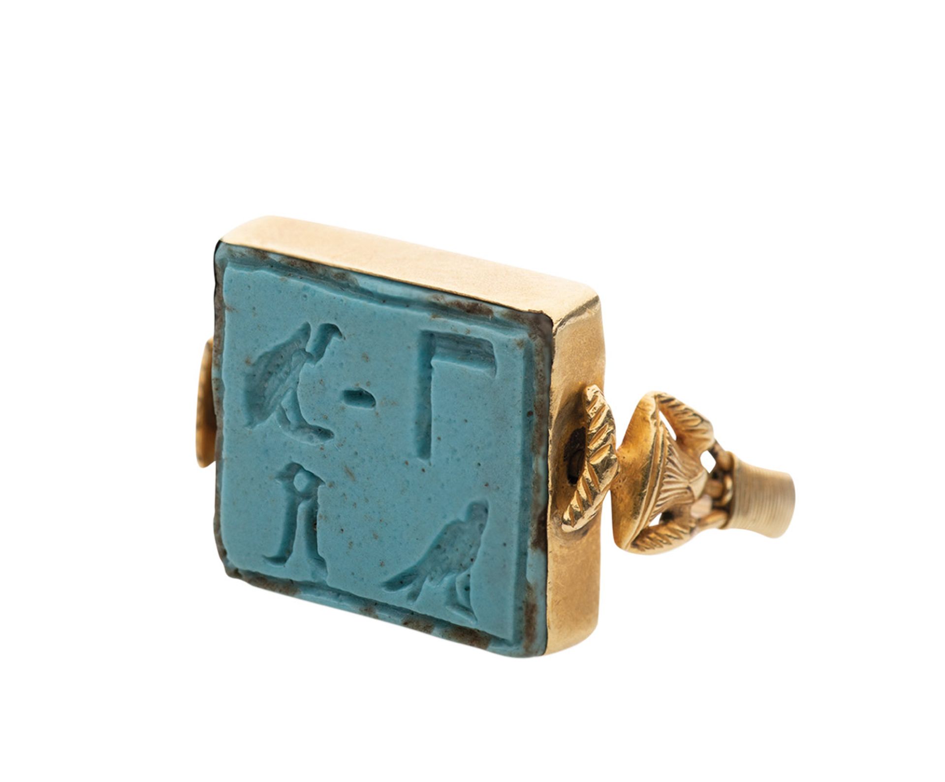 £5,000: this wearable ancient Egyptian turquoise amulet is on sale at London’s Kallos Gallery. Dating from the Third Intermediate Period (1070-664BC), the 1.8cm-wide plaque was mounted in an Egyptian revival gold swivel ring in the early 20th century, and can be worn with either side on display. One side depicts the mother goddess Isis feeding a newborn Horus, the sky god, hidden from his murderous uncle Seth among the marshes of the Nile delta. Its reverse bears the hieroglyphic inscription: “May the divine mother be a protection amulet”. Egyptian turquoise amulet, dating from the Third Intermediate Period (1070-664BC). Courtesy of Kallos Gallery