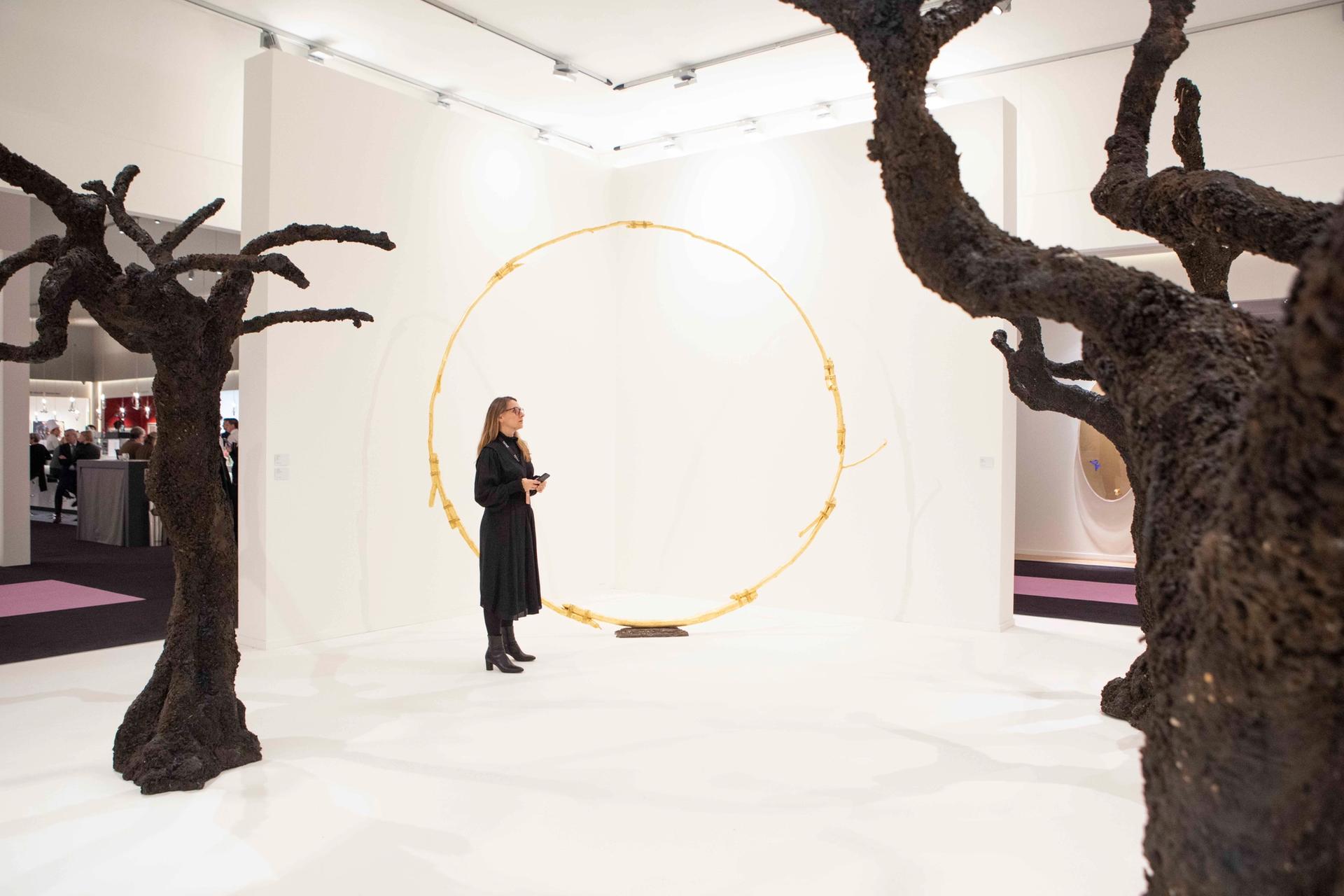 Kamel Mennour's stand with Ugo Rondinone's tree and sun works Courtesy of Tefaf