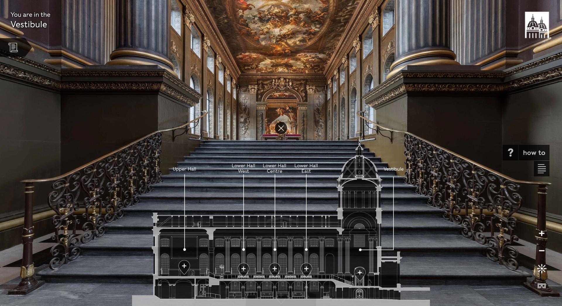 A screenshot from the virtual tour of the hall of the Old Royal Naval College in Greenwich, London