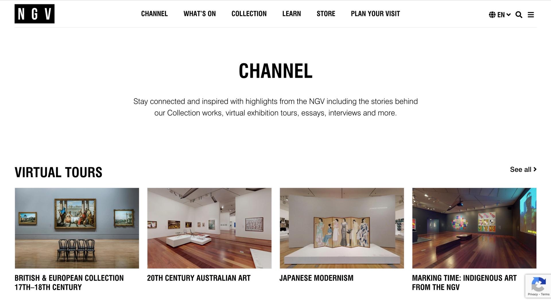 The National Gallery of Victoria in Melbourne, Australia, has developed a very impressive Channel section on its website. From here you can choose from almost 20 well made 360-degree tours of the collection and the building or listen to discussions on art; watch videos on specific works and artists; or read from a selection of digitised publications. One of the coolest features is the self-guided tours section where you can download a gallery map and then choose how to work through the spaces, whether through "Slow Art" guided exercises looking at specific works or with art-led meditations sessions.
