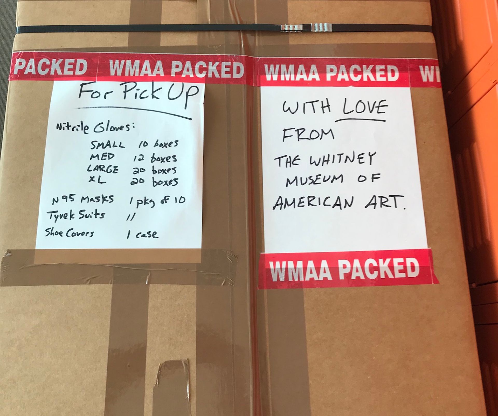 “We devised a plan for one of us who was able to ride to the museums to pack-up all our available supplies on hand, both in the museums itself and our storage facilities,” Reynolds says. “Once Scott Rothkopf and Jerry Saltz shared the picture of our contribution awaiting pick-up [on social media], attention in the art world grew rapidly.”