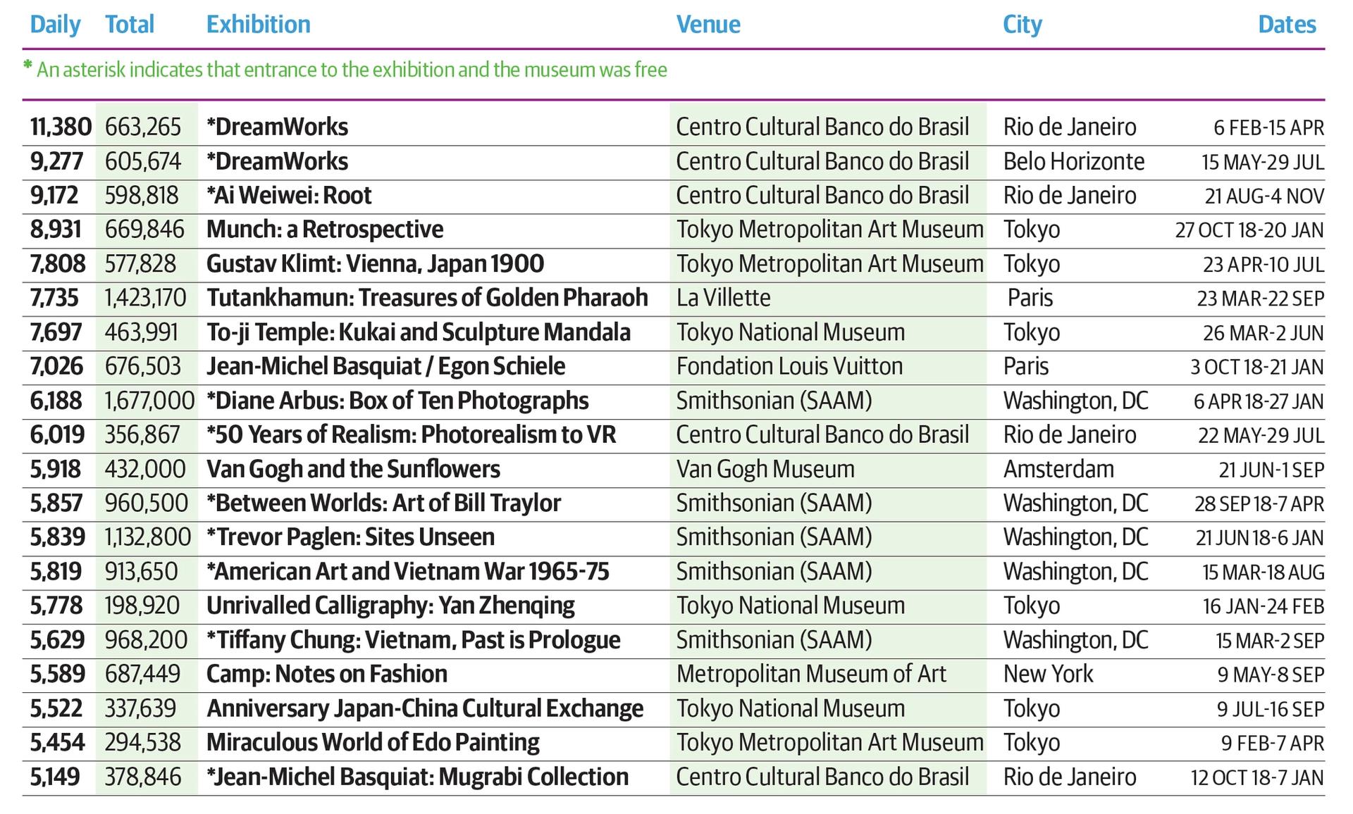 • For The Art Newspaper’s full Art’s Most Popular visitor figures survey, see our April issue. To read a selection online, see Art’s Most Popular 2020