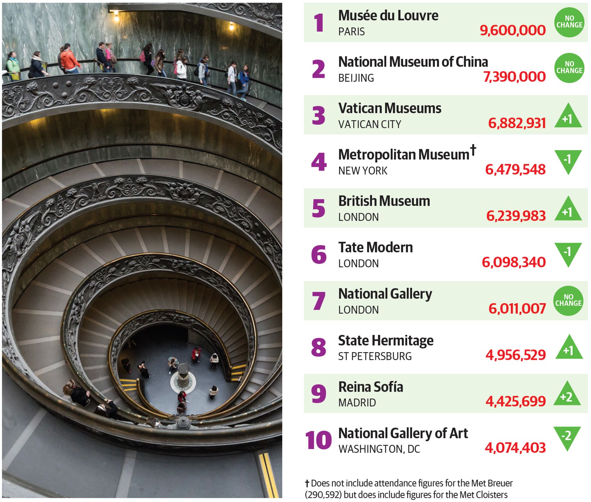 The National Museum of China in Beijing retains second position overall with 7.4 million visitors, followed by the Vatican Museums (6.9 million), which places third for the first time. It swapped places with the Metropolitan Museum of Art (6.5 million), which is down from the nearly seven million who graced its halls in 2018 when it hosted its blockbusting Costume Institute show Heavenly Bodies (1.7 million; 10,919 daily) at both its Fifth Avenue and Cloisters locations.