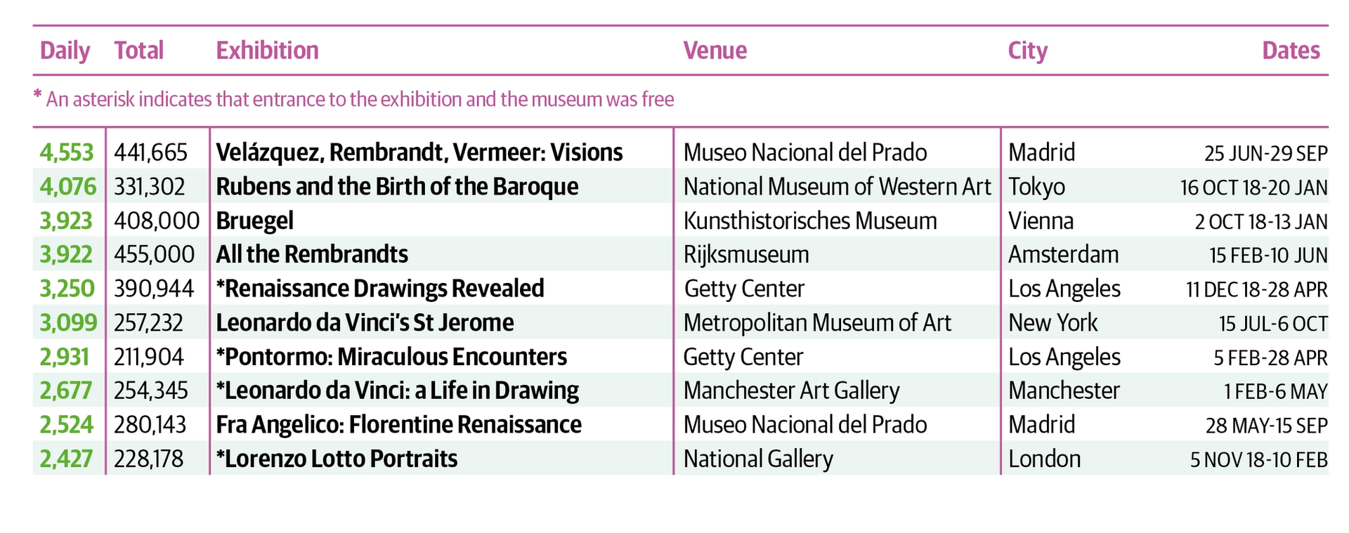 Given the widespread Leonardo hype in and outside the art world on the quincentenary of his death last year, it comes as no surprise that two monographic shows of his drawings—at the Metropolitan Museum of Art, New York, and The Queen’s travelling exhibition of 80 drawings that peaked in Manchester—should make the top ten. It is very likely that the Louvre’s recently closed Leonardo show will top the Old Masters category in our 2020 survey. Hype also contributed to a strong turnout at the Rijksmuseum’s somewhat misleadingly titled All the Rembrandts, which featured all the museum’s works by the Dutch master, not his entire oeuvre. However, “all the works” came close to being an accurate description of the Bruegel show at Vienna’s Kunsthistorisches Museum, which was seen by 3,923 visitors a day. The exhibition marked the 450th anniversary of the Flemish artist's death. The Prado pulled off a coup with its Velázquez, Rembrandt, Vermeer exhibition. Although there is little evidence that either Velázquez or Rembrandt were even aware of one another’s work (and neither would have had a clue about Vermeer), the Spanish show nevertheless presented a number of intriguing comparisons.