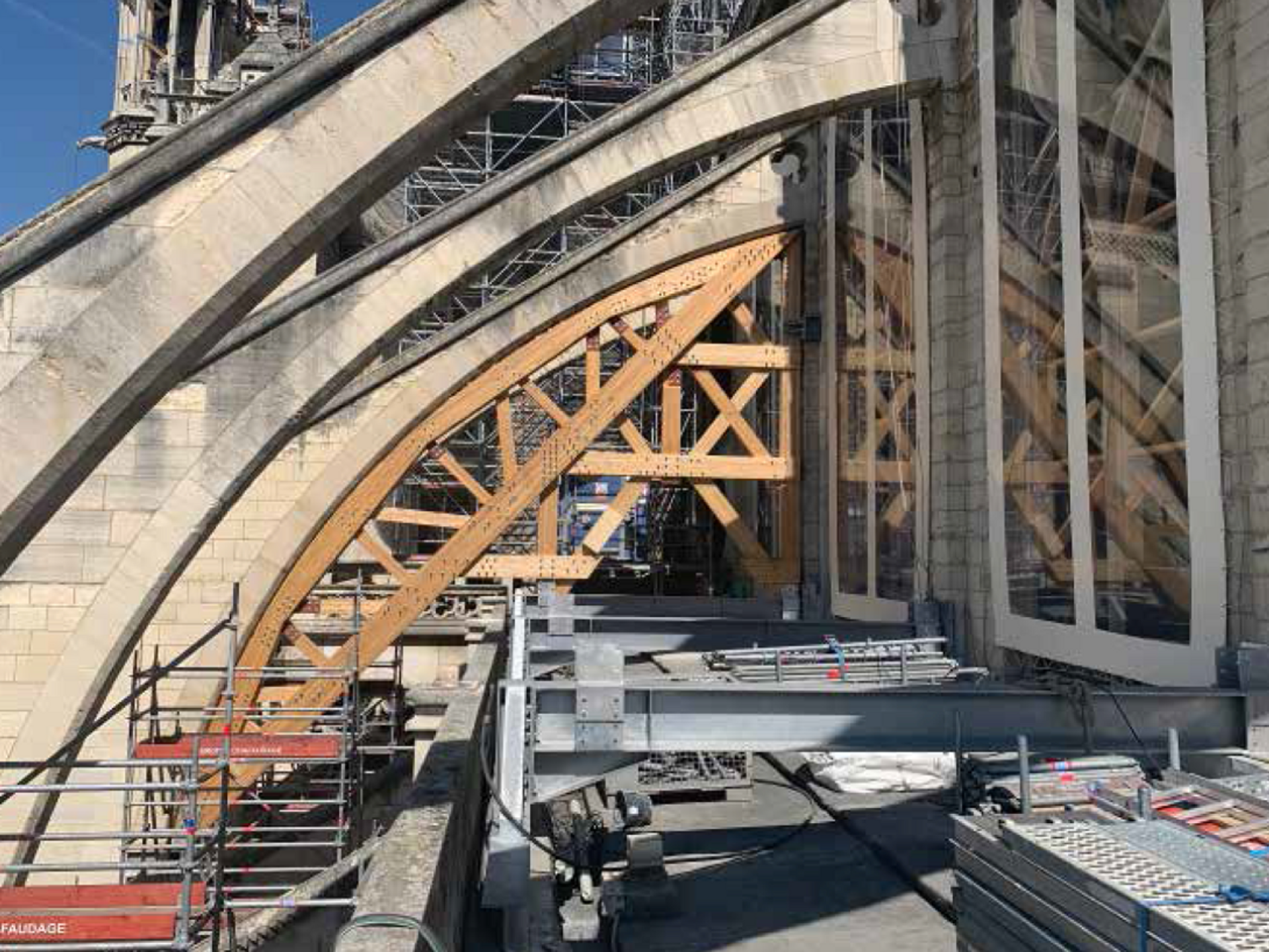 Preliminary tests on the transepts show that the vaults have resisted the fire well, thanks to the thick layer of limestone lying over them. A temporary mobile roof (parapluie roulant) has been built over the choir to give access to the vaults from above, and another will be constructed over the nave. Once these tests have been done, scaffolding will be built inside the cathedral in order to place the vaults’ support centrings and allow their restoration to start.