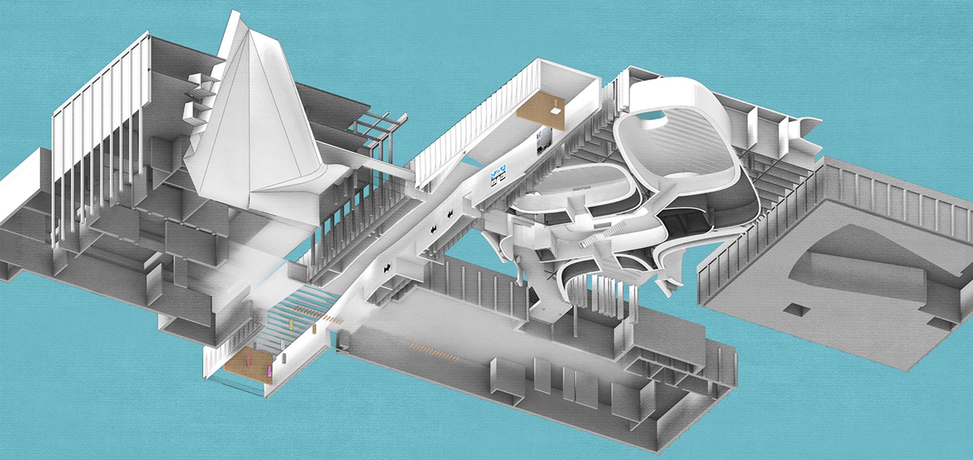 The Vienna firm Coop Himmelb(l)au proposed a landscape plinth and two three-level gallery wings. Circulation on ramps connecting these components would be encased by amorphous forms whose “openness to the outside refreshes the museum visiting experience”, Citizens’ Brigade says.