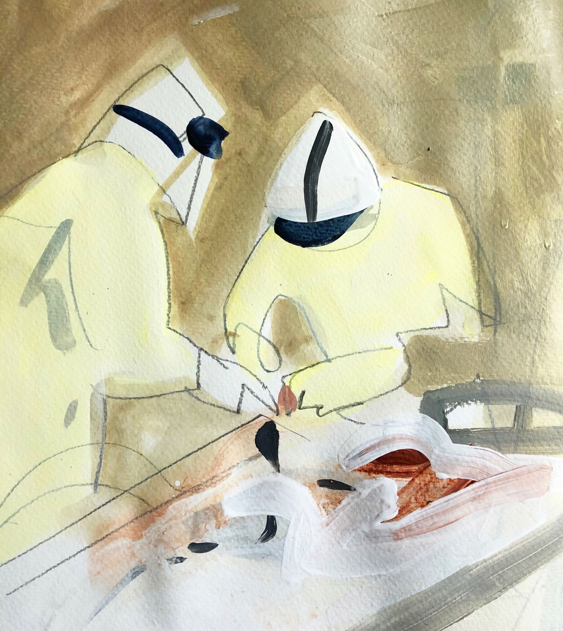 She also frequently taps into art history. One painting of three doctors bending over a patient is apparently based on Guido Reni’s The Adoration of the Shepherds (around 1640) in the National Gallery “where there is light pouring from the centre” and she also talks about how the doctors can appear like angelic beings or slightly predatory and Bosch-like in their helmets”.