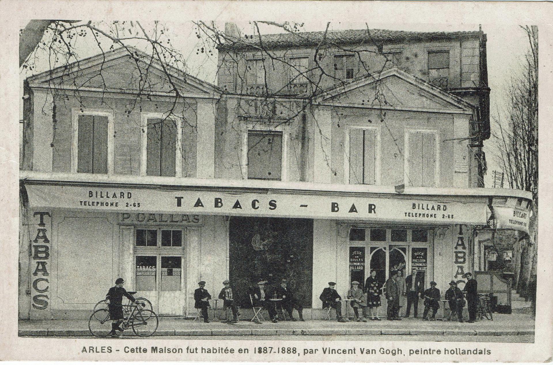 Van Gogh’s life revolved around Place Lamartine, much of which can be seen in his vibrant painting of The Yellow House (1888), set under a deep blue sky. Next door, under the awning, was a grocery shop run by François and Marguerite Crévoulin, a convenient place to buy necessities. Further to the left, in the pink building behind a tree, was the restaurant of 70-year-old Marguerite Vénissac, where Van Gogh took his suppers. Beyond that, further to the left (but just outside the painting), was the all-night Café de la Gare, which he patronised. On the right side of the painting, the Route de Tarascon runs into the countryside where Van Gogh created some of his finest landscapes.