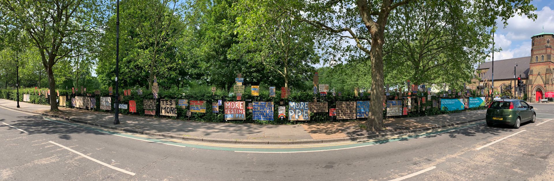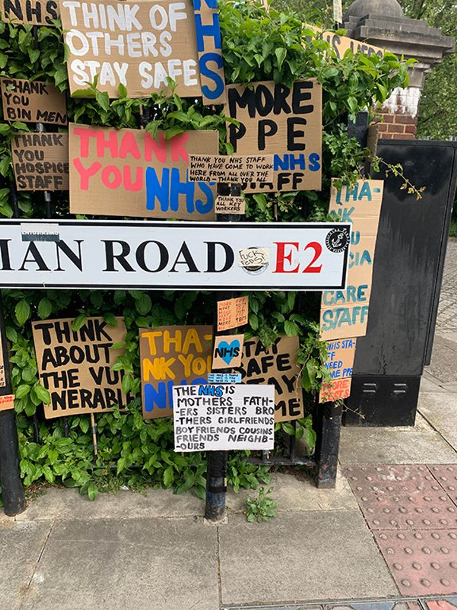 Over the past few weeks a colourful mass of hand-painted cardboard signs have been mysteriously appearing on the railings of Wennington Green, a patch of public parkland at the junction of Roman and Grove Roads in East London. Bearing positive messages of thanks and support for the NHS and key workers, the forest of over 500 placards clusters around the Roman Road sign and continues to creep further up the street, getting bigger every day. Amidst the tide of goodwill and gratitude there are also some sterner notes: “Isolate think of others,” reads one sign; “do not privatise the NHS”, “more tests”, “stay 2m apart”, “more PPE”, read others.