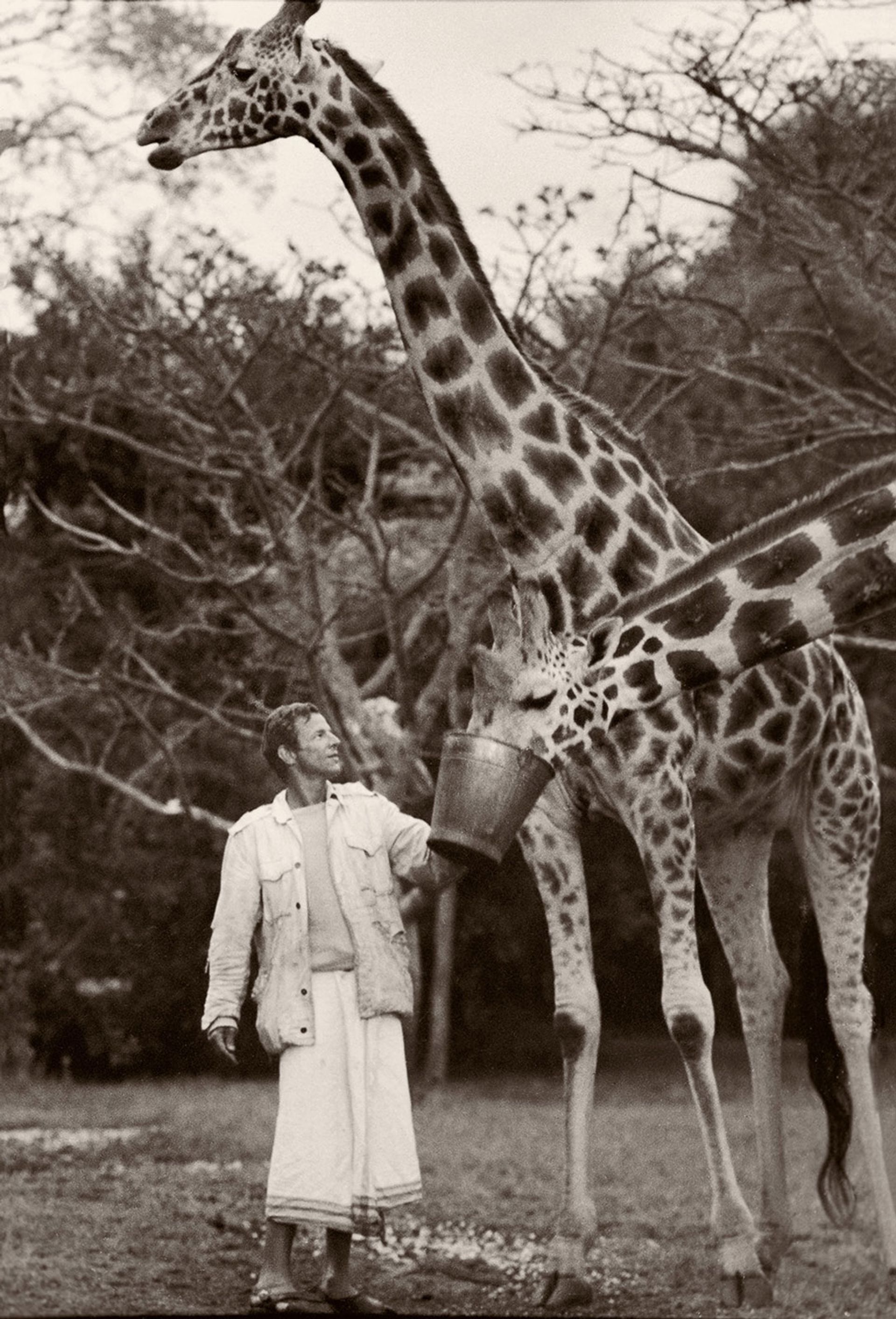 Peter Beard and giraffes at the Hog Ranch front lawn in 1985 © 2020 Peter Beard