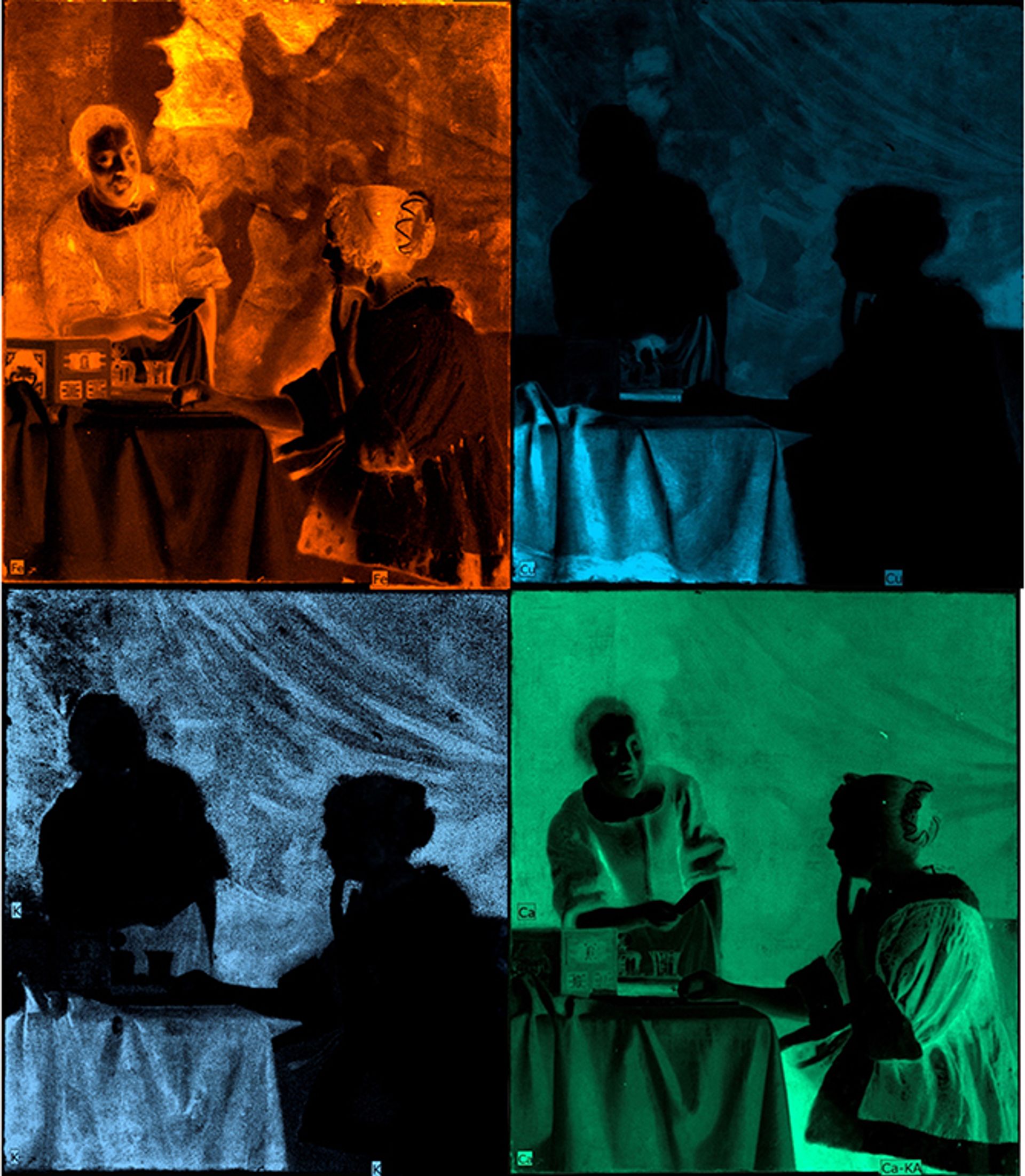 Elemental distribution maps obtained by macro X-ray fluorescence in Vermeer’s Mistress and Maid showing the original composition in the background, later covered by Vermeer with a curtain, and the form of the curtain, which is now discoloured and has lost form due to the degradation of the copper-based pigment used to paint it. Clockwise, from top left: iron, copper, calcium and potassium. Silvia A. Centeno, Department of Scientific Research, the Metropolitan Museum of Art