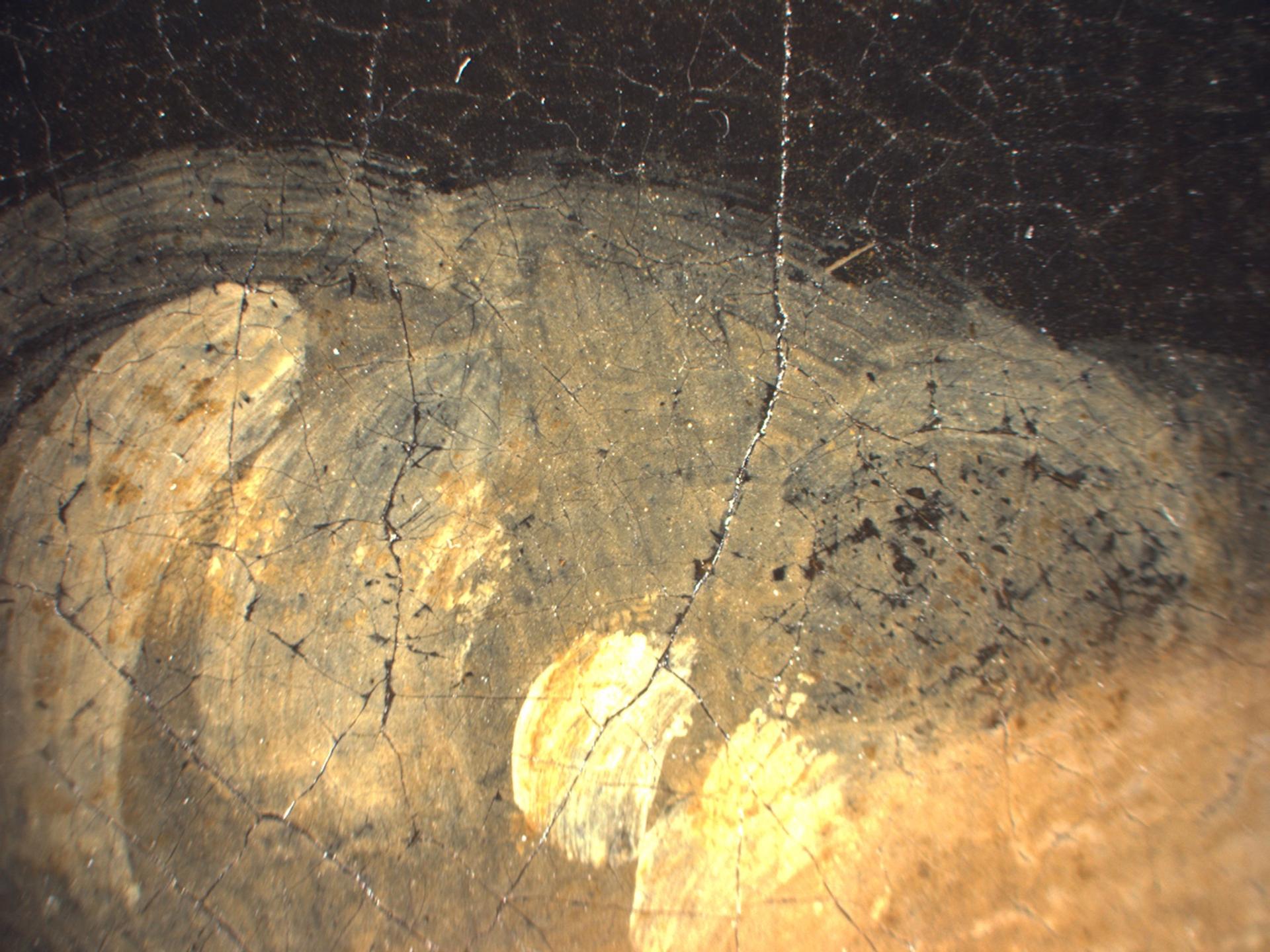 Photomicrograph taken in an area of the mistress’s hair, showing that it is painted over the curtain in the painting's background Dorothy Mahon, Paintings Conservation, the Metropolitan Museum of Art