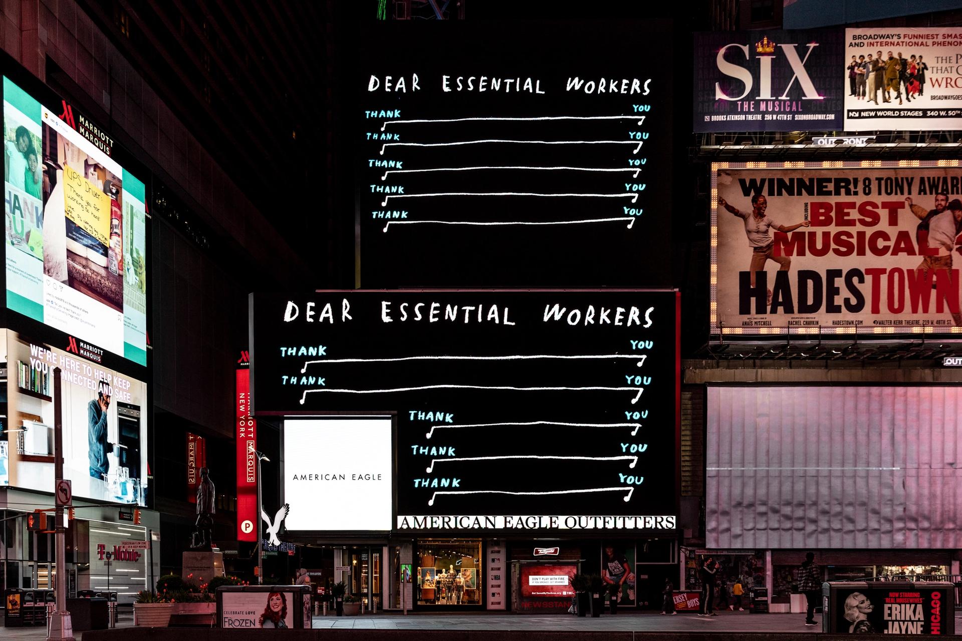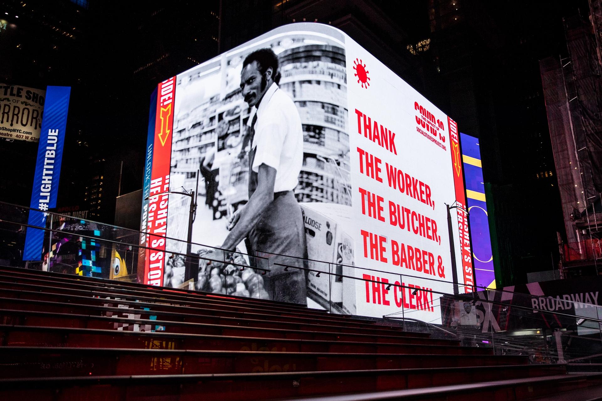 Last month, the public art programme Times Square Arts, PRINT magazine and the New York-based museum Poster House teamed up to display artist-designed coronavirus-related messages of hope for the city, gratitude for its essential workers, and notes on public safety on nearly 1,800 digital billboards throughout the city’s five boroughs. The campaign’s second phase—organised by Times Square Arts and Poster House, along with the artist-run political action committee For Freedoms—begins today, with billboards designed by 12 artists including Jenny Holzer, Christine Sun Kim, Carrie Mae Weems, Mel Chin and Pedro Reyes. Reyes also donated an exclusive print to raise funds for The New York Immigration Coalition (NYIC), which launched the #NYunitedFund to help ensure the health and safety of New York’s immigrant communities. In addition to the 1,774 billboards shown throughout the five boroughs, this second phase of the project will spread to over 300 billboards throughout Chicago and Boston.