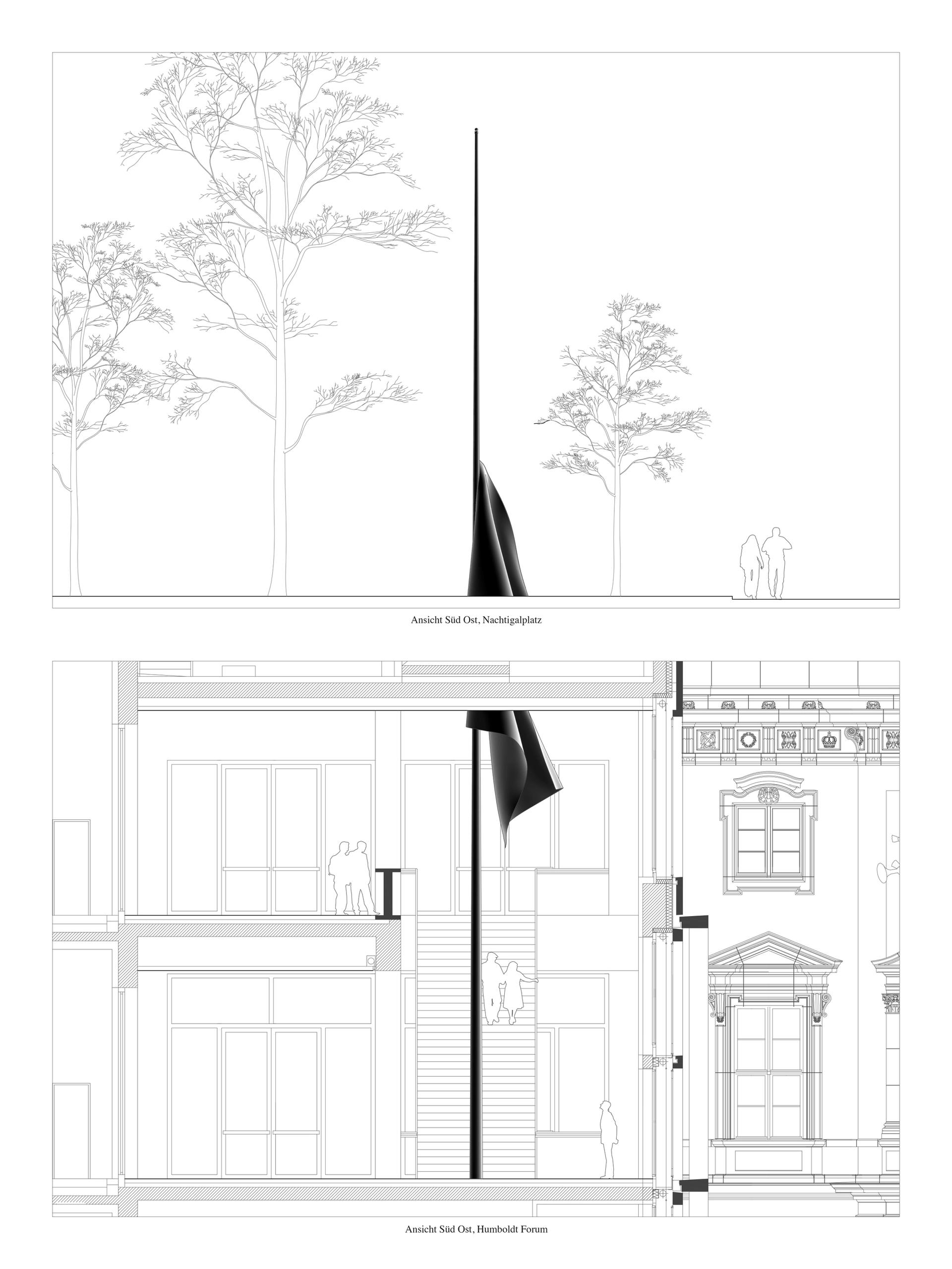 Called Statue of Limitations—a play on words referring to legal statutes that can serve as an obstacle to restitution claims—the black patinated sculpture is separated into two parts. While the 11-metre tall lower half of the flag is in a stairwell of the Humboldt Forum between the second and third floors, the upper half will be placed off-site in a square in the so-called African Quarter of the Berlin's Wedding district making a direct link to the city's colonial history. The sculpture in the square will be a temporary installation to celebrate the inauguration of the museum. It will be installed once the two floors of Humboldt Forum finally open to the public, probably in spring next year.