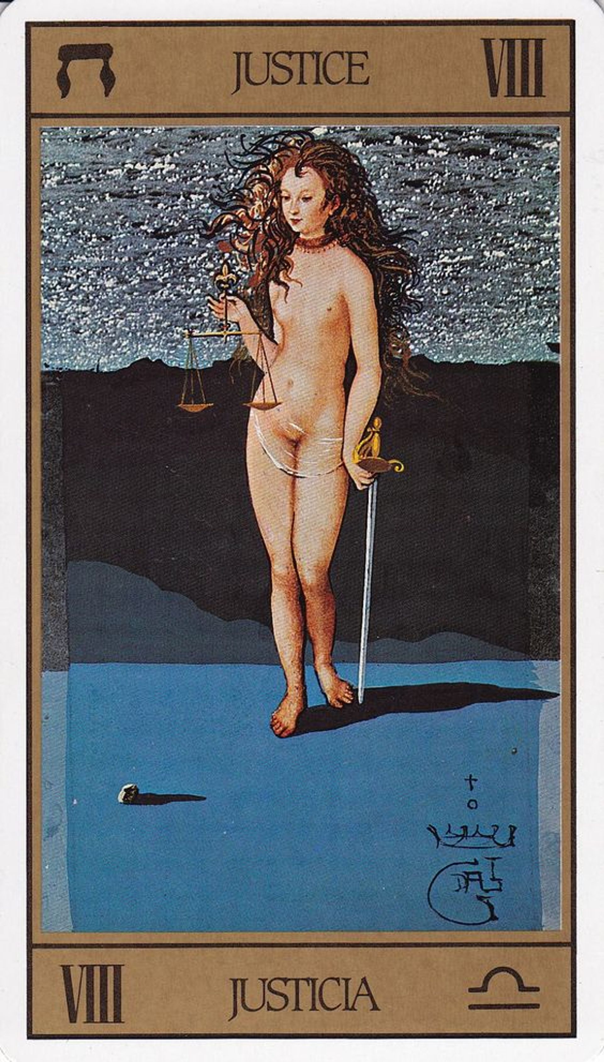 The Justice card as designed by Dalí for his own signature tarot deck. © Cartamundi, Turnhout Belgium © Salvador Dalí, Fundació Gala-Salvador Dalí, VG Bild-Kunst, Bonn 2019