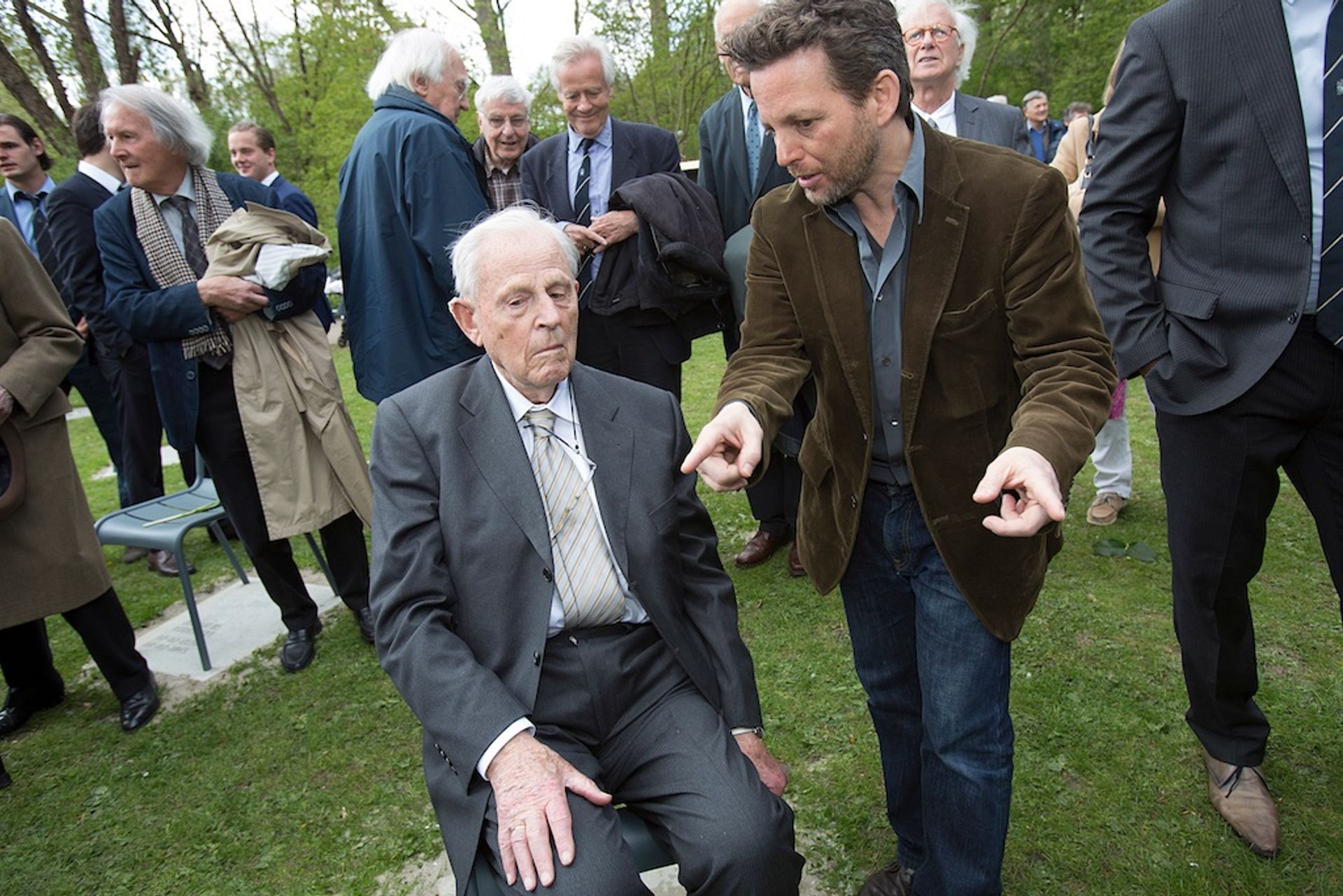 Johan van Gogh on the chair of his brother Theodoor at the unveiling of Monument Rozenoord in 2018, with the artist Ram Katzir © Studio Ram Katzir; photo: Katrien Mulder