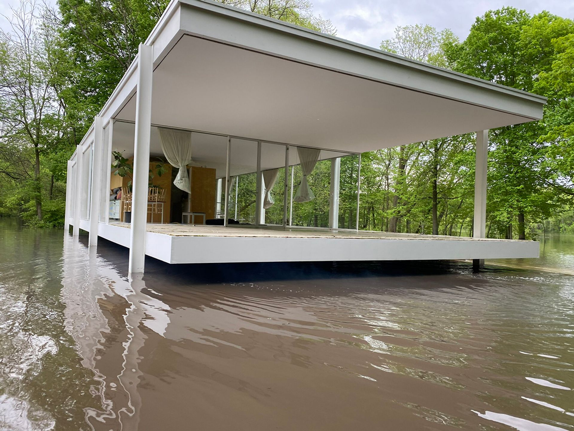 Floodwaters from the Fox River inundated the glass and steel house’s deteriorating lower terrace on Monday and rose to within a foot of the house’s stilt-hoisted single-floor living area, says Scott Mehaffey, the executive director. The incursion arrived at a time when swaths of the Midwestern US had been ravaged by pounding rain.
