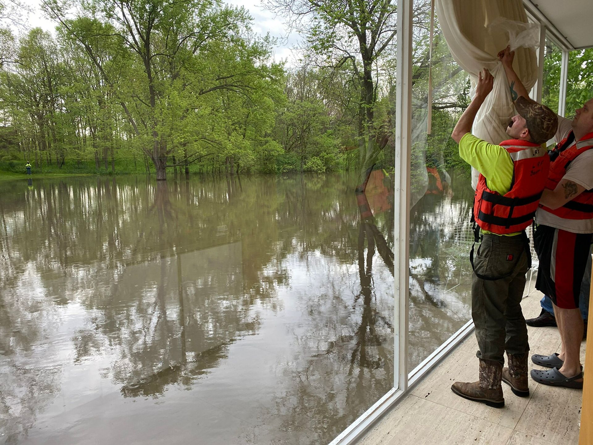 Visiting the house in an inflatable raft with a fire and rescue squad on Monday, the executive director and others rolled up the rugs, placed furniture atop milk crates and pulled curtains up away from the floor. “Luckily, all the Mies van der Rohe furniture is in storage,” he says. “What’s in the house now are facsimiles of Edith Farnsworth’s [Scandinavian and Italian Modern] furniture,” in line with the site’s 2020-21 focus on the client who commissioned the house. When the house’s second owner, Peter Palumbo, restored the house in 1970-72, he and Dirk Lohan, Mies’s grandson, furnished the house with pieces of the architect’s design, Mehaffey explains.