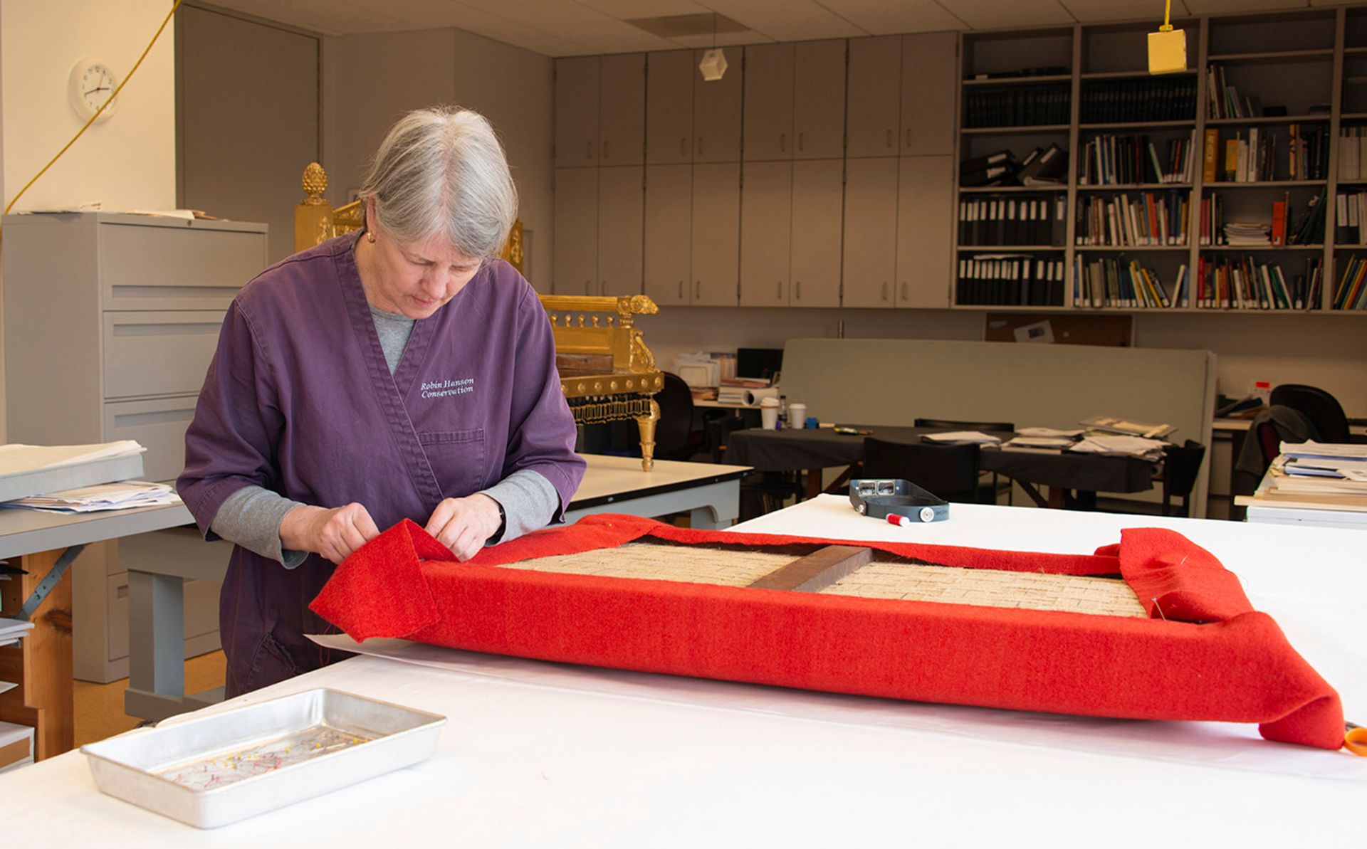 Robin Hanson, an associate conservator of textiles at the Cleveland Museum of Art, working on the seat cushion of a settee designed by Thomas Hope before the museum shut down Courtesy of Cleveland Museum of Art
