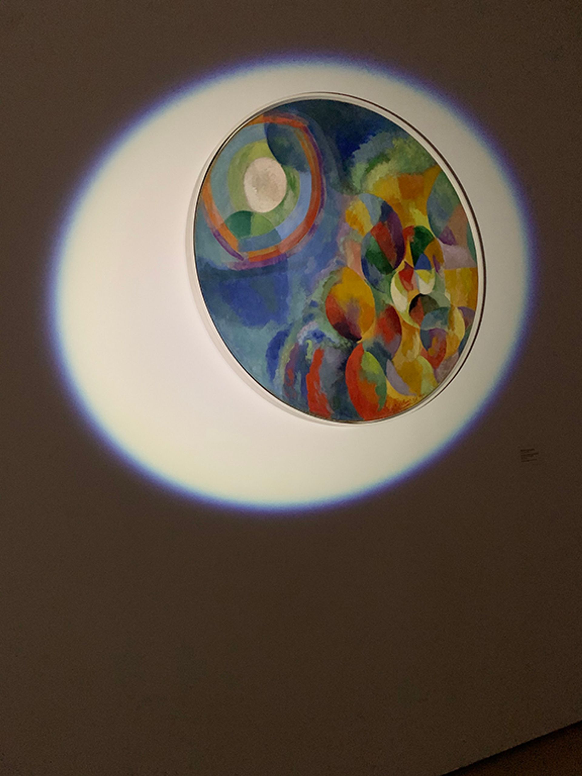 Robert Delaunay’s Simultaneous Contrasts: Sun and Moon (1913) in the Museum of Modern Art’s fifth-floor galleries, illuminated by the paintings conservator Michael Duffy’s flashlight beam as he completes regular checks of the galleries during closure Photo by Michael Duffy, courtesy of the Museum of Modern Art