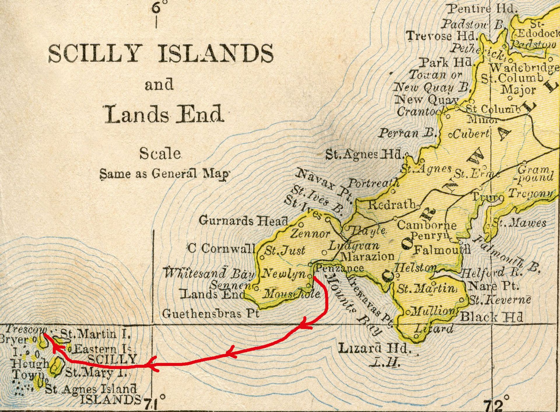The sea route that Christopher Woodward is planning to swim, from Newlyn in Cornwall to Tresco in the Isles of Scilly
