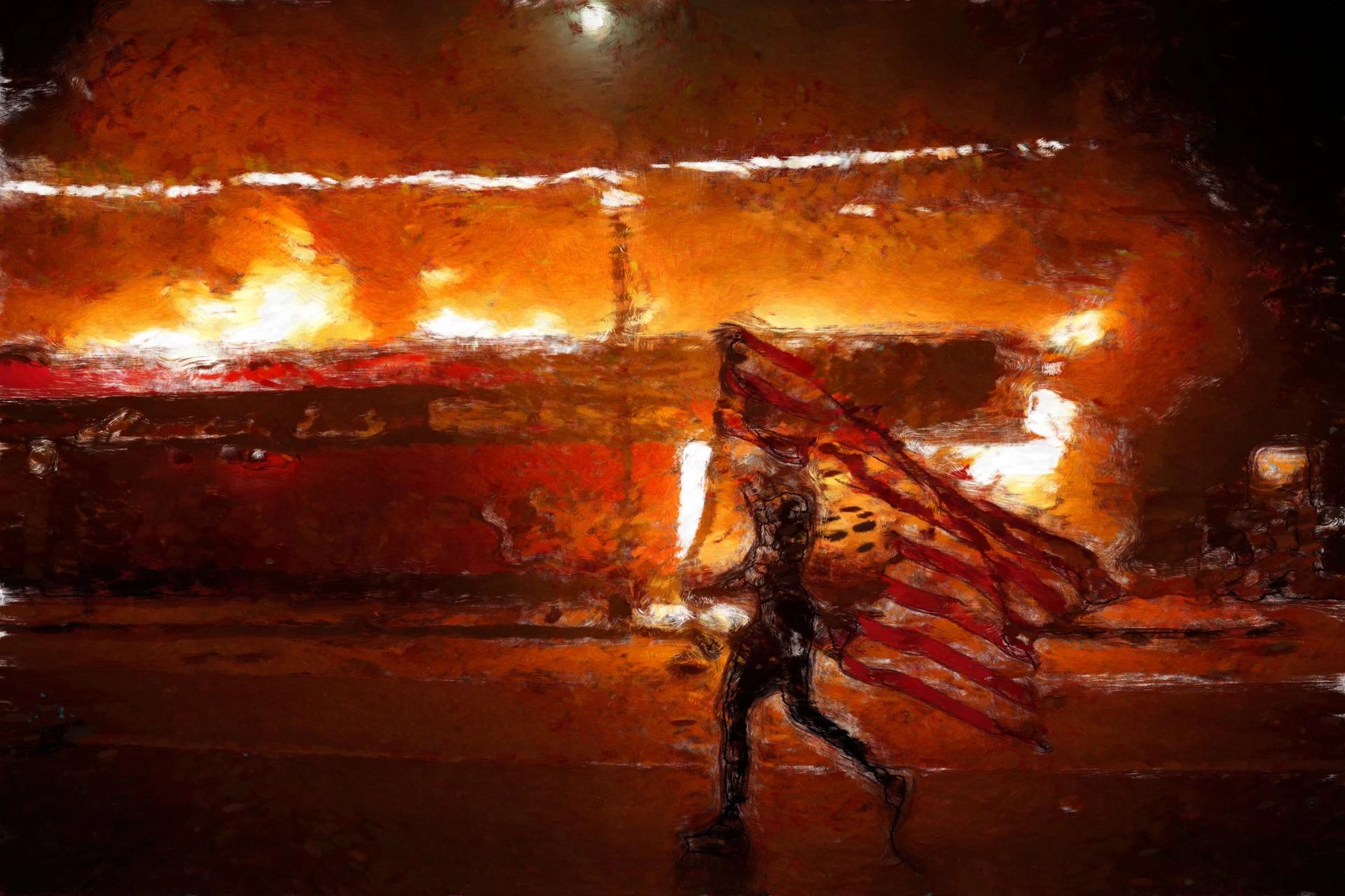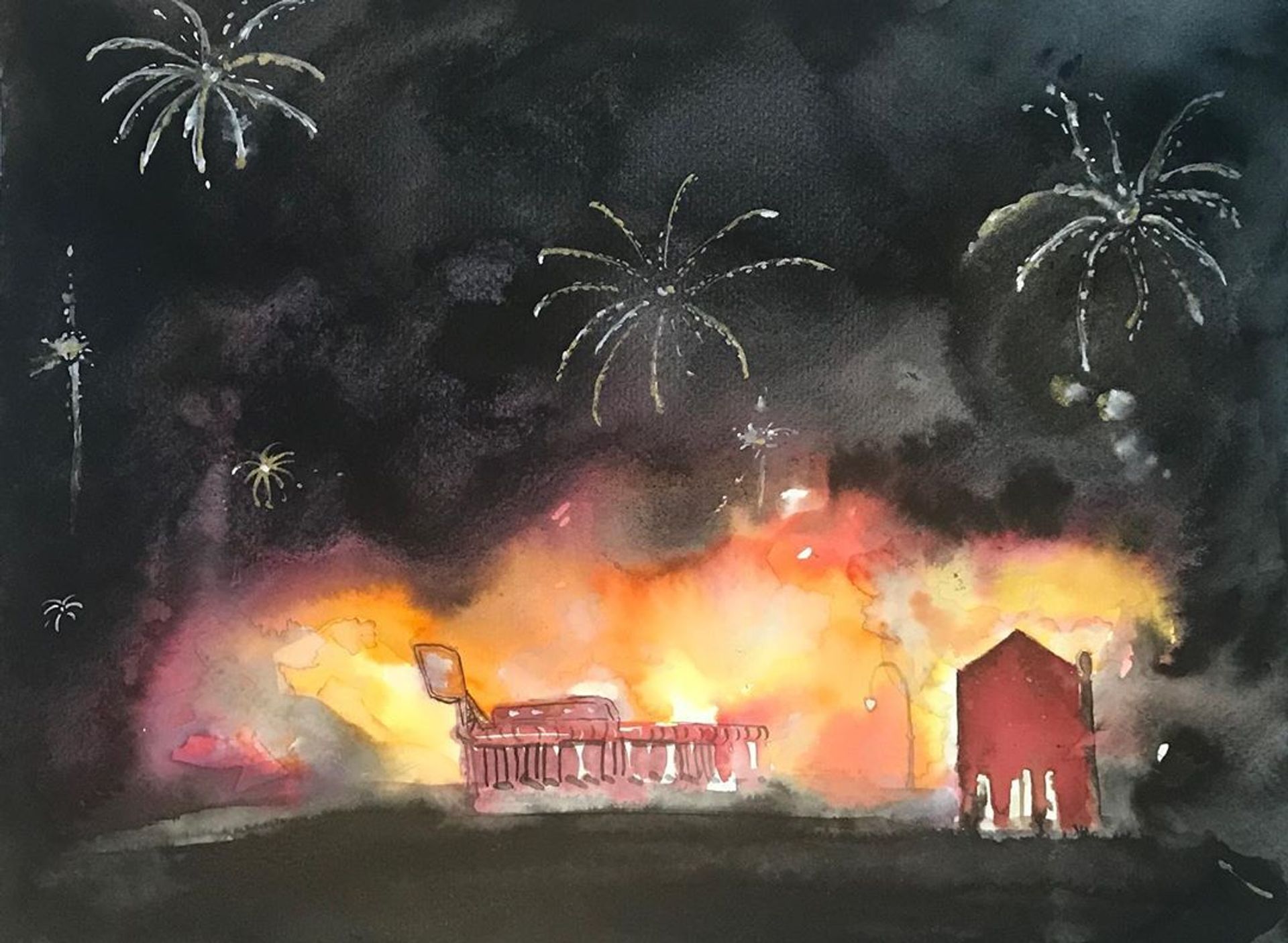 For many artists the movement is deeply personal. The Nigerian-born New York-based artist and musician Laolu Isaac Senbanjo, who created a painting of black figures with their hands up facing an onslaught of political images said: "I had to pause several times while making this, and come back to it. It’s unfortunate that in America people have to pretend like everything is okay. Everything is not okay. My feelings of frustration and hurt as a black person living in America have been one of the most profound experiences of my life." Kambui Olujimi created ink drawings if the 3rd precinct in Minneapolis burning based on video footage and included a short personal text that starts: "Being a big kid I was told incessantly, as if I didn’t hear the first forty times, how to move in the presence of police…"
