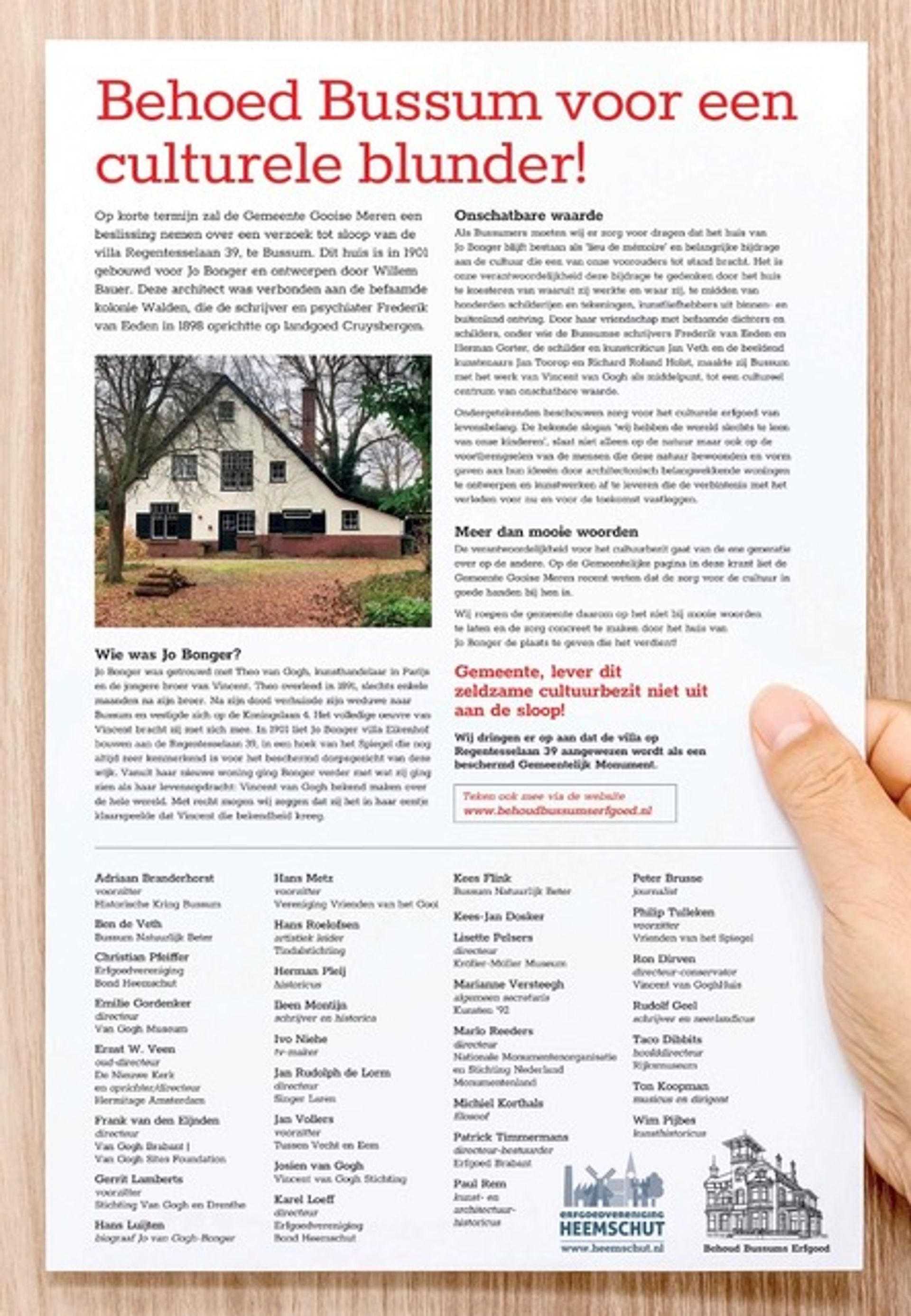On Wednesday evening the municipal council of Gooise Meren (which includes Bussum) voted to call for Villa Eikenhof to be declared a monument. A key factor behind the decision was the protest letter against the proposed demolition with some very influential names. The municipality will now consider the matter and it will be open to the owner of the property to appeal a decision. So the threat remains; but there is now a reasonable chance that “the Van Gogh villa” can be saved.