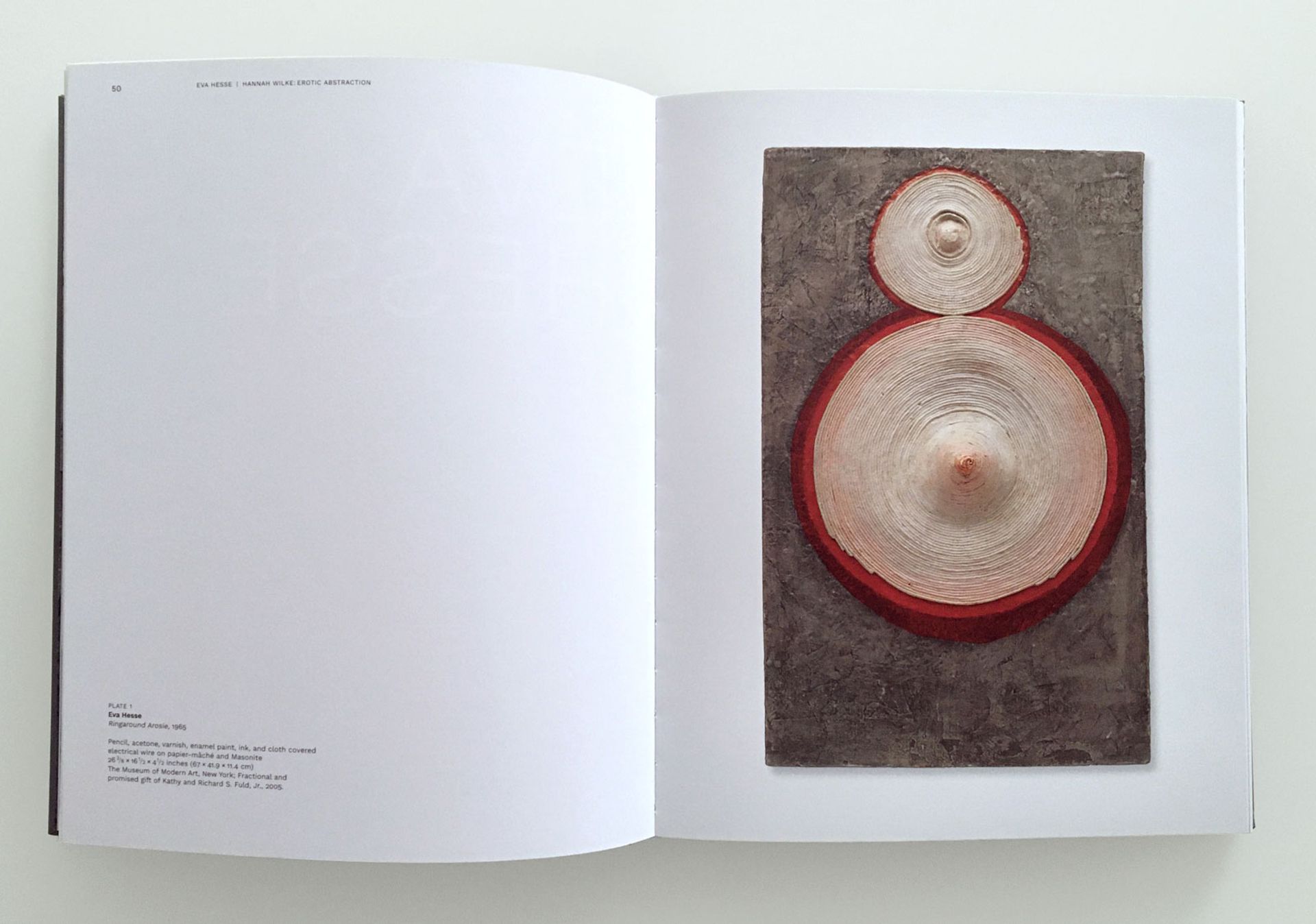 A spread from the catalogue showing Eva Hesse with her sculpture Several in her New York studio in 1969 and Hannah Wilke work titled Super-t-Art (1974)