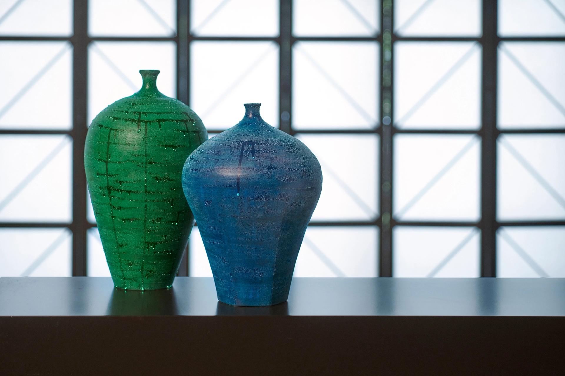 Green Mist (2020) and Blue Mist (2020), two porcelain vases with a silver mist over-glaze by the Japanese artist Takahiro Kondo, both sold by Adrian Sassoon for £8,000 each Courtesy of Adrian Sassoon