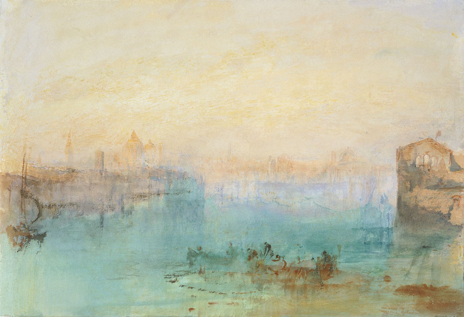 This watercolour, showing a vessel in the foreground bathed in a blue light, captures the vast scale of the Giudecca Canal, allowing Turner to be slightly more experimental. Warrell says that “in his field notes, the western Giudecca was a place that resonated in his later work. Much of this has to do with the width and openness of the canal, which enabled him to produce expansive prospects of Venice, where the waterfronts on either side frame the natural drama of light—whether sunrise or sunset—infusing and transforming the space in between.” The wispy outline of Venetian landmarks around the perimeter, such as the campanile of San Marco, frame the atmospheric work.