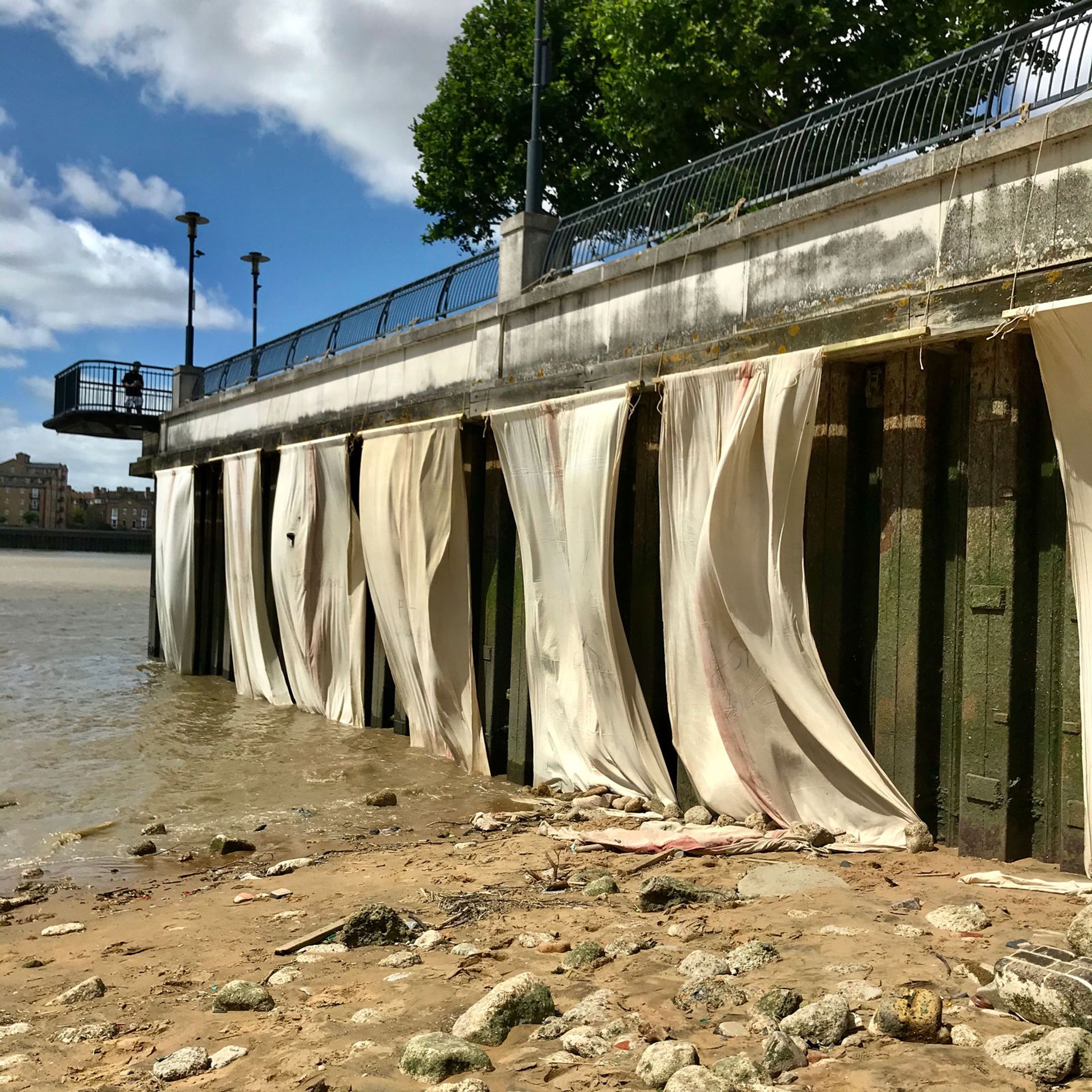 Providing a backdrop to these shoreside antics and forming the other strand of Bean’s monthly Come Hell or High Water programme on this scrap of Thames foreshore were 14 giant calico cloths, suspended from the embankment walls down to the beach below. Back in summer 1992, these 40ft banners were installed by the artist Mary Lemley at low tide at the point where 14 forgotten London rivers feed into the Thames, from the Beverley Brook in Putney to the Ravensbourne in Deptford Creek. They were then removed at the next low tide, sometimes caked with mud, sometimes crusted with debris or—in the case of the cloth submerged in Earl’s Sluice at Rotherhithe—shrimps.