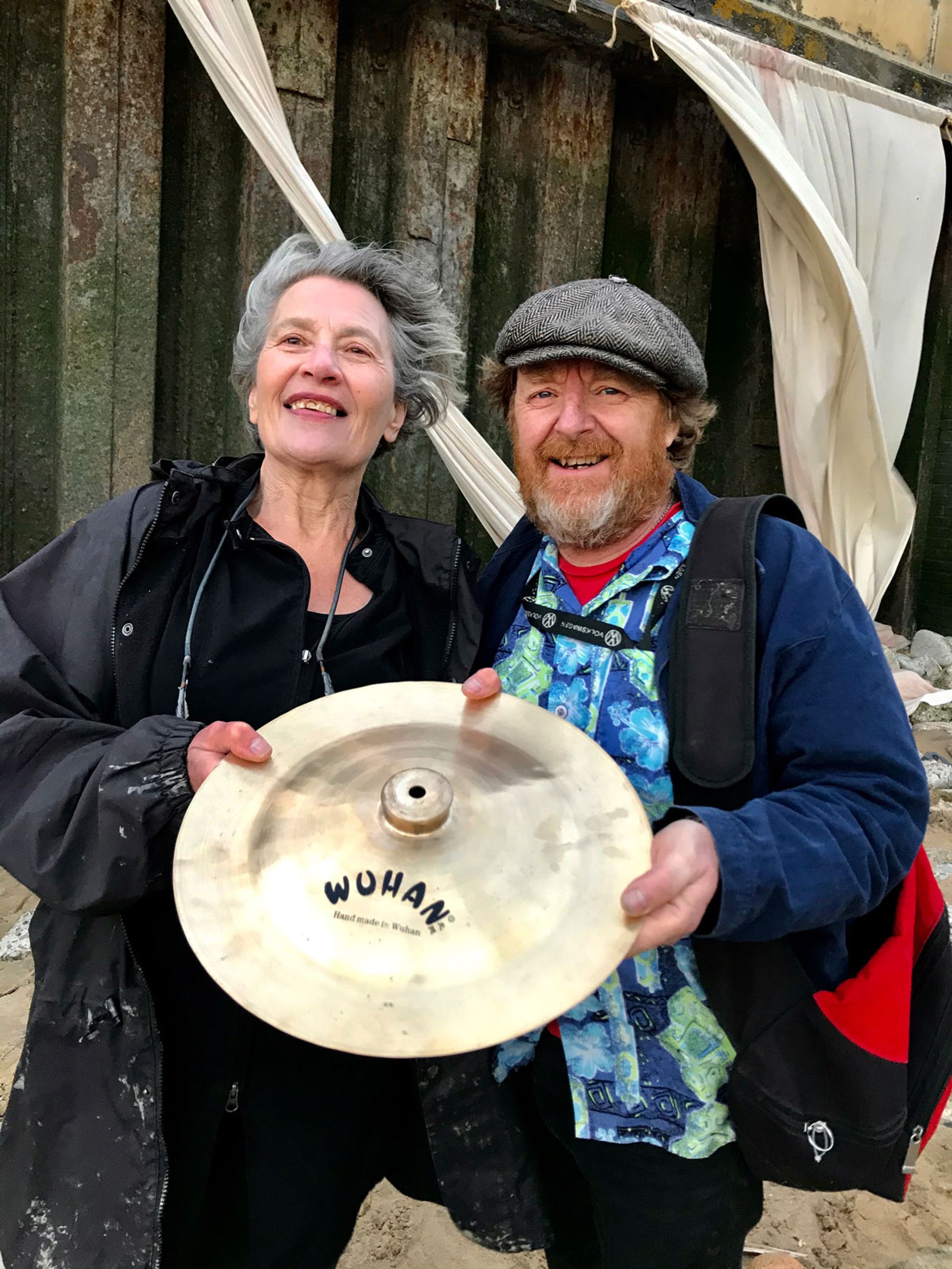 Anne Bean and Richard Wilson showing off one of their Wuhan cymbals