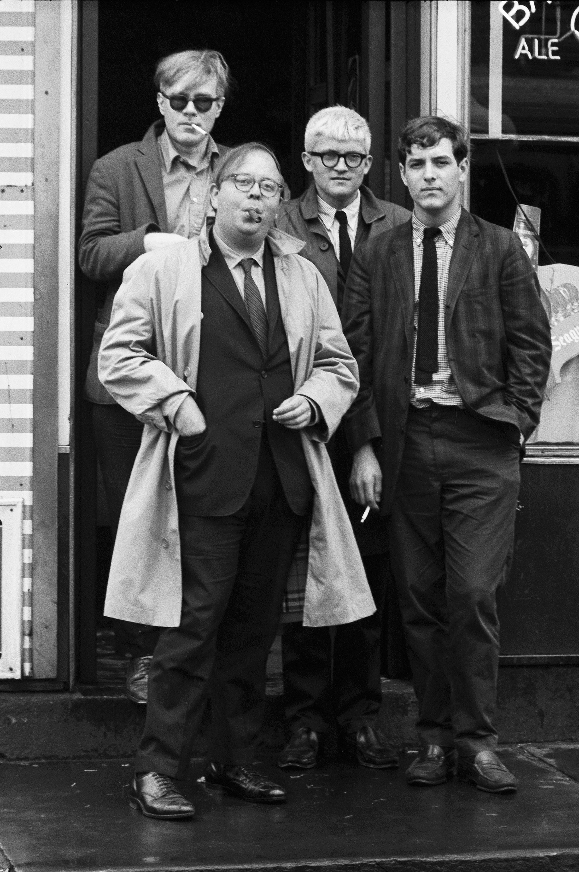 Andy Warhol, Henry Geldzahler, David Hockney and Jeff Goodman in 1963 © Dennis Hopper, Courtesy of The Hopper Art Trust