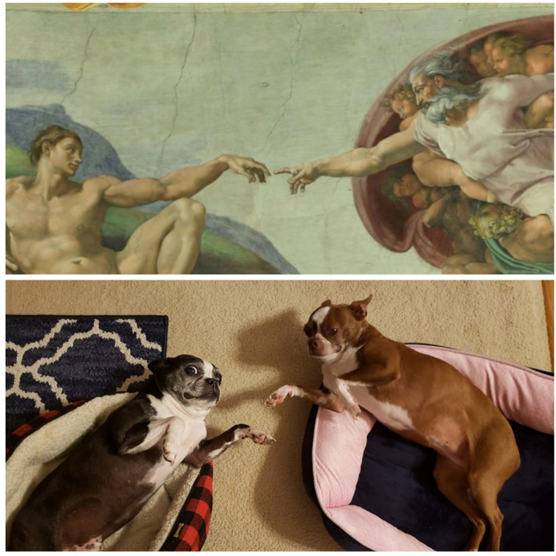 When officials at the Getty in Los Angeles threw down the highly imaginative gauntlet to re-create works of art at home using just three items—ranging from toilet rolls to spaghetti—little did they expect to see the cutest of cats modelled on Édouard Manet’s Jeanne (Spring), 1881; or a pair of French bulldogs connecting in the style of Michelangelo’s epochal Sistine Chapel painting The Creation of Adam (around 1508).