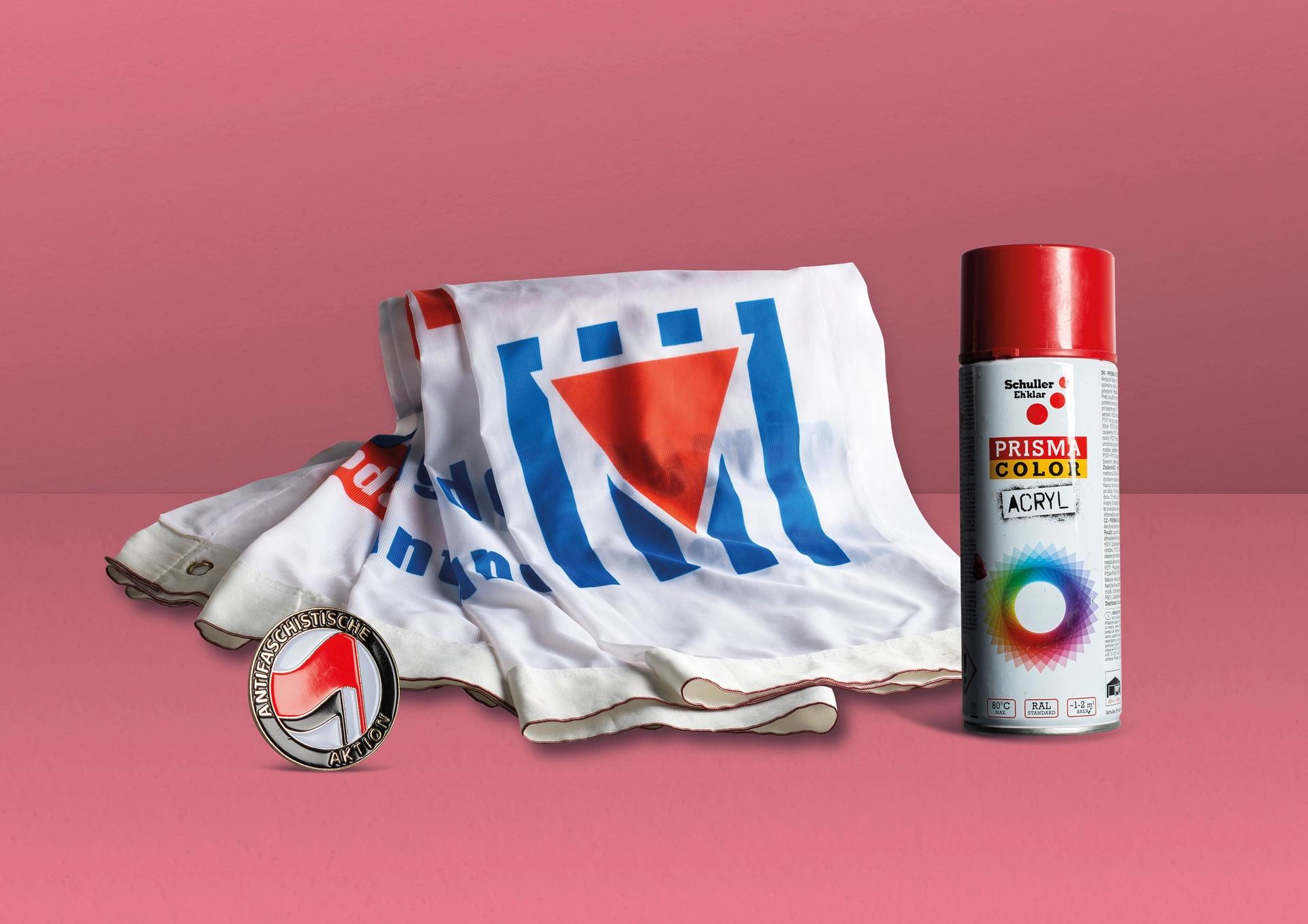 The ten “anti-fascist” items on show include a spray can used by the German activist Irmela Mensah-Schramm. “She has been spraying [over] Nazi graffiti for 30 years,” the collective says. “We bought these ten objects from committed anti-fascists for €1,000 each. We have transferred therefore €10,000 [taken from the exhibition project budget of €24,000] to the antifa [cause],” a spokeswoman adds.